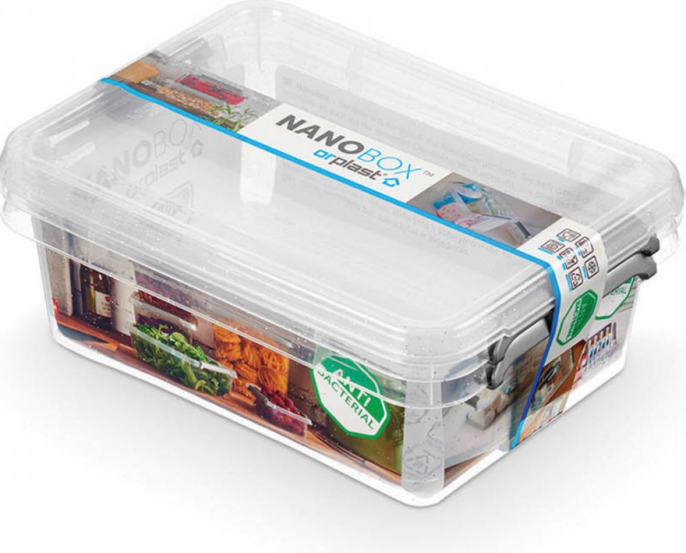 Nanobox je antibakteriální box s obsahem stříbra. Ionty stříbra obsažené v plastu, vč. rukojetí, zámků a víka, účinně chrání proti plísním, široké škále bakterií a jiných patogenů. Ideální pro využití: veřejná místa, - školy, školky, a hygienicky náročných provozů vč. zdravotnických zařízení. Uzavřená nádoba je bezpečnější pro zdraví a pomáhá udržovat její obsah svěží a čistý. Materiál: Polypropylen s obsahem iontů stříbra je bez zápachu, bezpečný pro alergiky, má antibakteriální a oxidační vlastnosti dosahující až 99% účinnosti. Obsah: 3,1 l. Rozměry: 195 x 150 x 80 mm. Vyrobeno v EU.