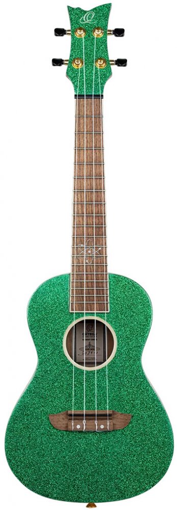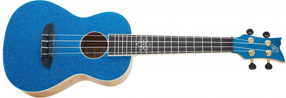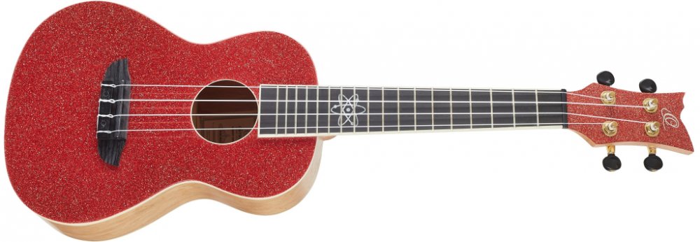 Akustické ukulele Ortega z řady Element Series zdobí finiš přední desky v podobě červené, modré, černé nebo zelené lesklé metalízy, barevně sladěná dýha hlavice a výrazný inlay hmatníku.