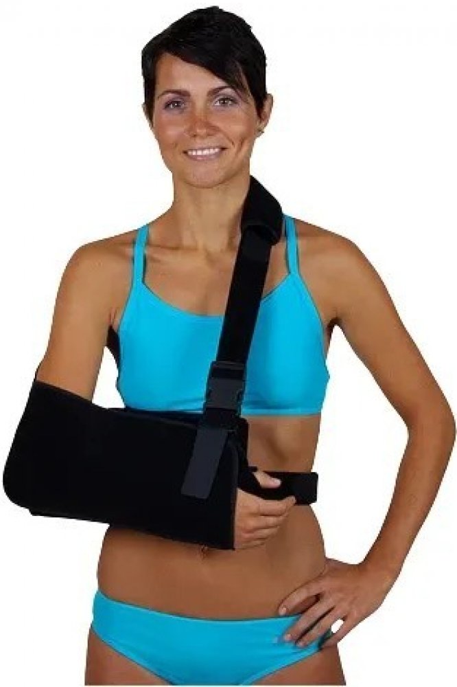 Jedná se o jednodílný ramenní závěs vyráběný ze třívrstvé textilie. Principem tohoto typu ortézy je fixace předloktí v zavěšené „tašce”, která je vypolstrovaným popruhem upevněna na krku.