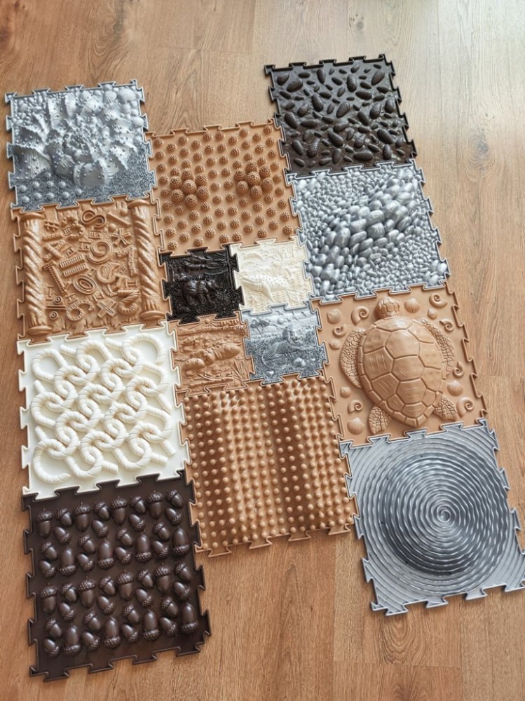 Obsah balení: 14 ks koberečků - 10 koberečků 25 х 25 cm a 4 koberečky 13 x 13 cm (1x šišky měkké, 1x žaludy tvrdé, 1x joga - pirueta měkká, 1x vlna tvrdá, 1x kamenný vrchol tvrdý, 1x želva tvrdá, 1x provazy měkké, 1x čísla tvrdá, 1x mušle tvrdá, 1x sněhové vločky měkké, 4x mini tvrdé povrchy se zvířátky - velryba, lev, hroch a medvěd).