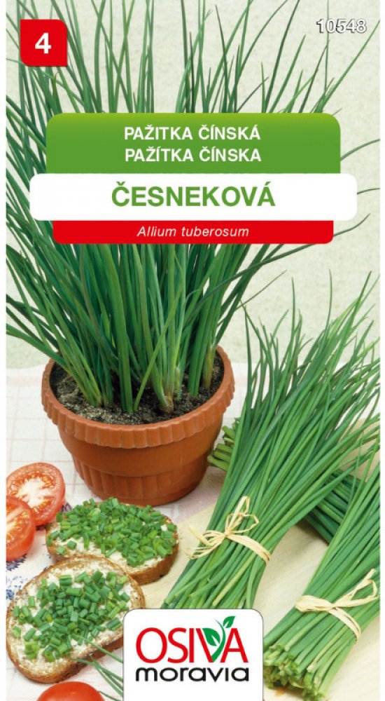 Česneko-pažitka. Vytrvalá bylina vysoká 35-50 cm. Kvete bílými hvězdicovitými květy. Ploché listy mají česnekové aroma. Seje se do sponu 20 - 30 x 20 cm po dvaceti semenech. Jak pěstovat pažitku česnekovou: Pažitka čínská venku nejlépe prospívá na světlém, slunném místě. V interiéru ji pěstujeme na chladnějším místě. U nás je česnekopažitka dostatečně mrazuvzdorná a vydrží na záhoně nebo v květináči několik let. Pažitka čínská vyžaduje dobře propustnou, výživnou a vlhkou zeminu. Osivo vyséváme od března do května přímo na záhon či do nádoby mělce do hnízd. Pěstební spon je 30 x 20 cm. Semínka vyklíčí a mezi 14 až 21 dny; potřebují mírnou, ale pravidelnou zálivku, aby zemina nezaschla. Můžeme si také předpěstovat sadbu (výsev v únoru a v březnu) a sazeničky vysadit do volné půdy nebo nádoby od dubna do května po 20 semenáčcích do hnízda. V prvním roce roste pomaleji než klasická pažitka, ale v dalších letech trsy zmohutní. Česnekopažitku sklízíme podle potřeby. Nať je nejlepší ještě před rozkvětem. Čím je pevnější poupě, tím je kvalitnější. Je-li květ zcela otevřený, je už pažitka čínská přezrálá.