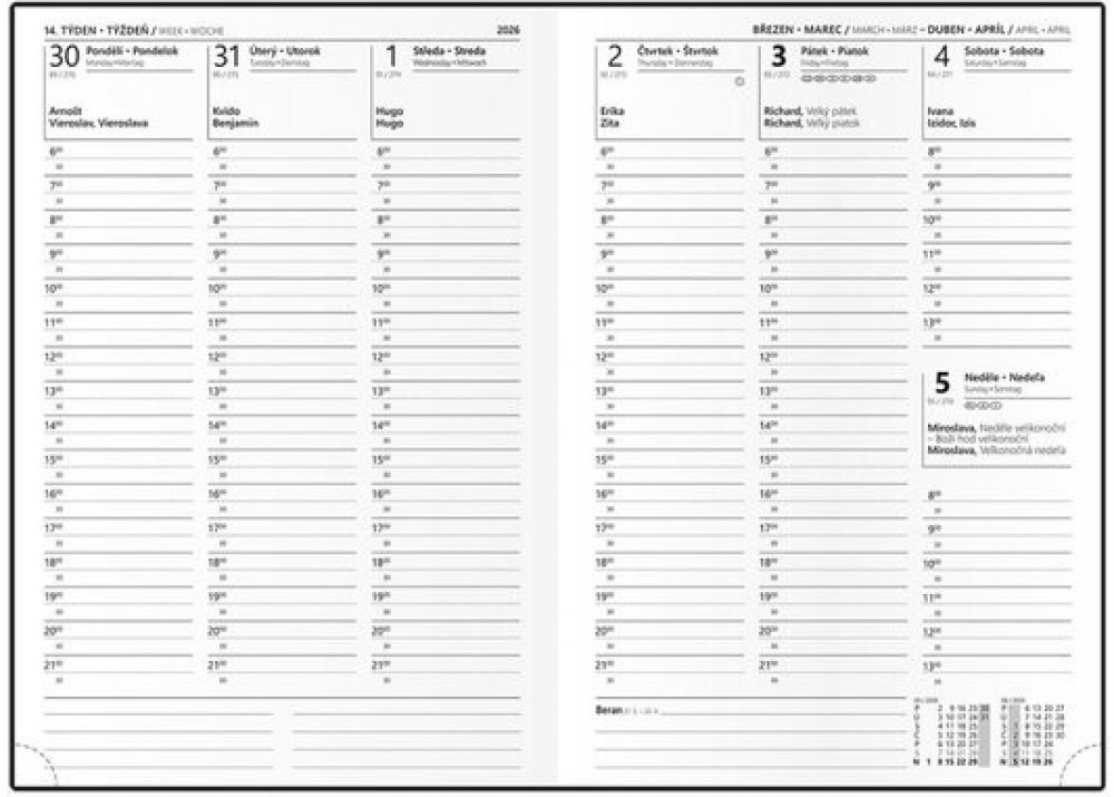 Popis : Týdenní diář formátu A5 je vyráběný z matného hladkého lamina s parciálním lakem, který dodává každému diáři šmrnc. Jedná se nejen o skvělý doplněk, ale také si budete moci efektivněji plánovat Váš čas.Druh sortimentu : Diář, Název : Týdenní diář 2026 Oskar Lamino A5 Les, Jazyk : Čeština,