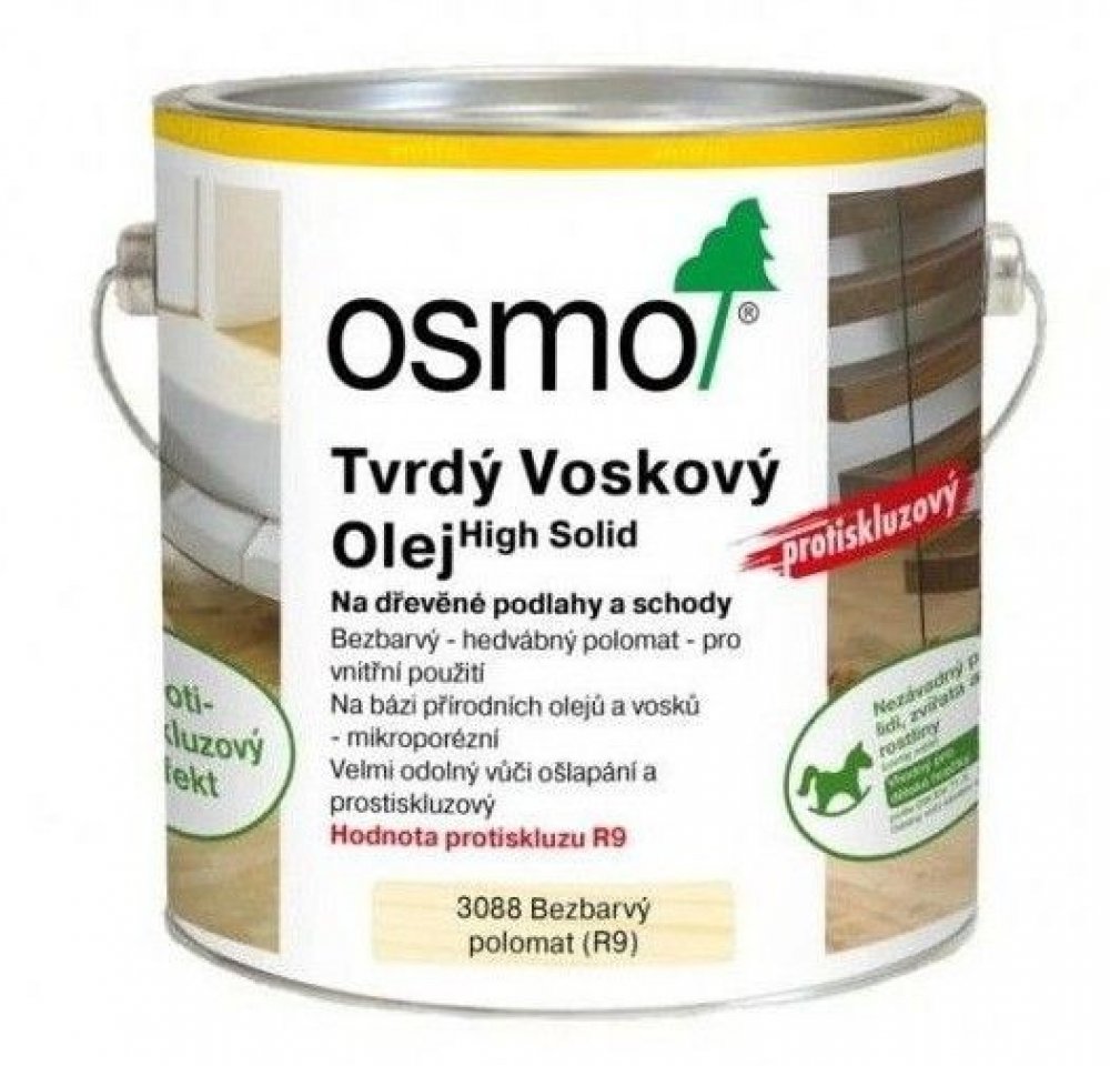 Osmo Tvrdý voskový olej protiskluzový 3088 se vyznačuje hedvábně lesklým, ale přesto protiskluzovým povrchem ( odolnost proti skluzu R9).