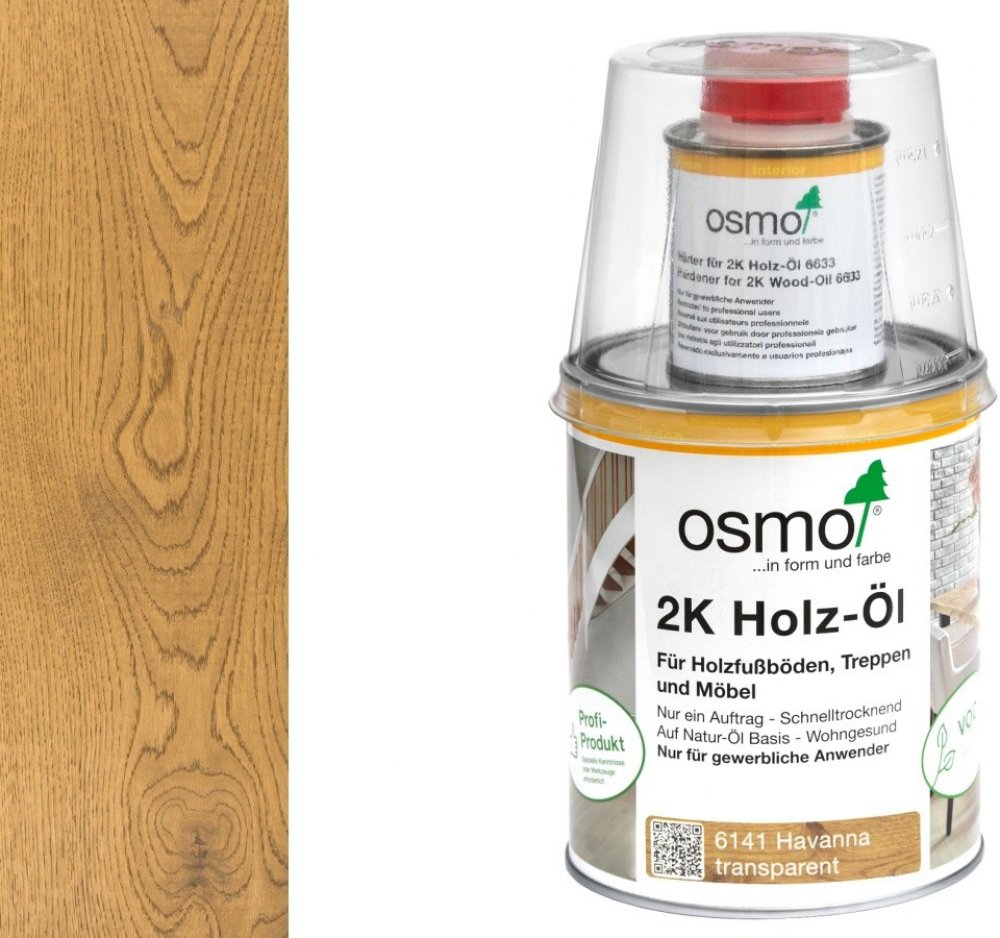 Osmo Olej na dřevo 2K je vhodný pro ošetření jakýchkoliv parketových a dřevěných podlah (masivní podlahy, selské podlahy, palubky, schody apod.) v souladu s normou DIN 18356; je vhodný i pro ošetření povrchu dřevěného nábytku. Je zvláště vhodný pro aplikaci na dřeva s vysokým podílem v něm obsažených látek a na použití ve veřejných prostorách, kde je vyžadováno použití přípravků neobsahujících rozpouštědla.