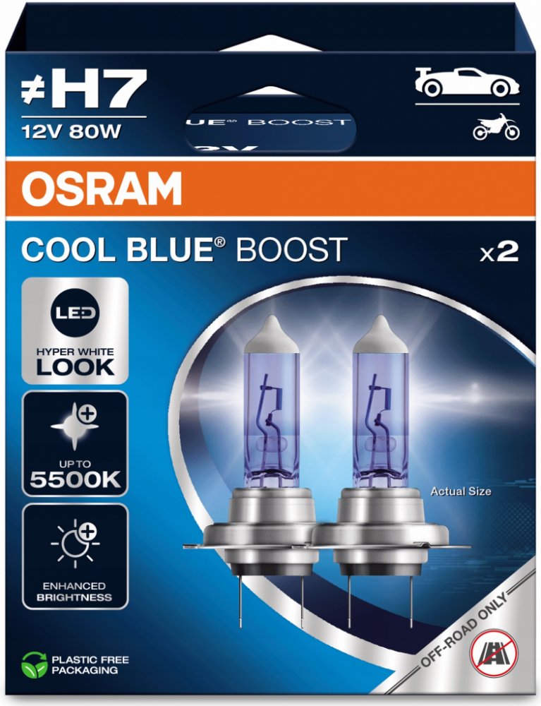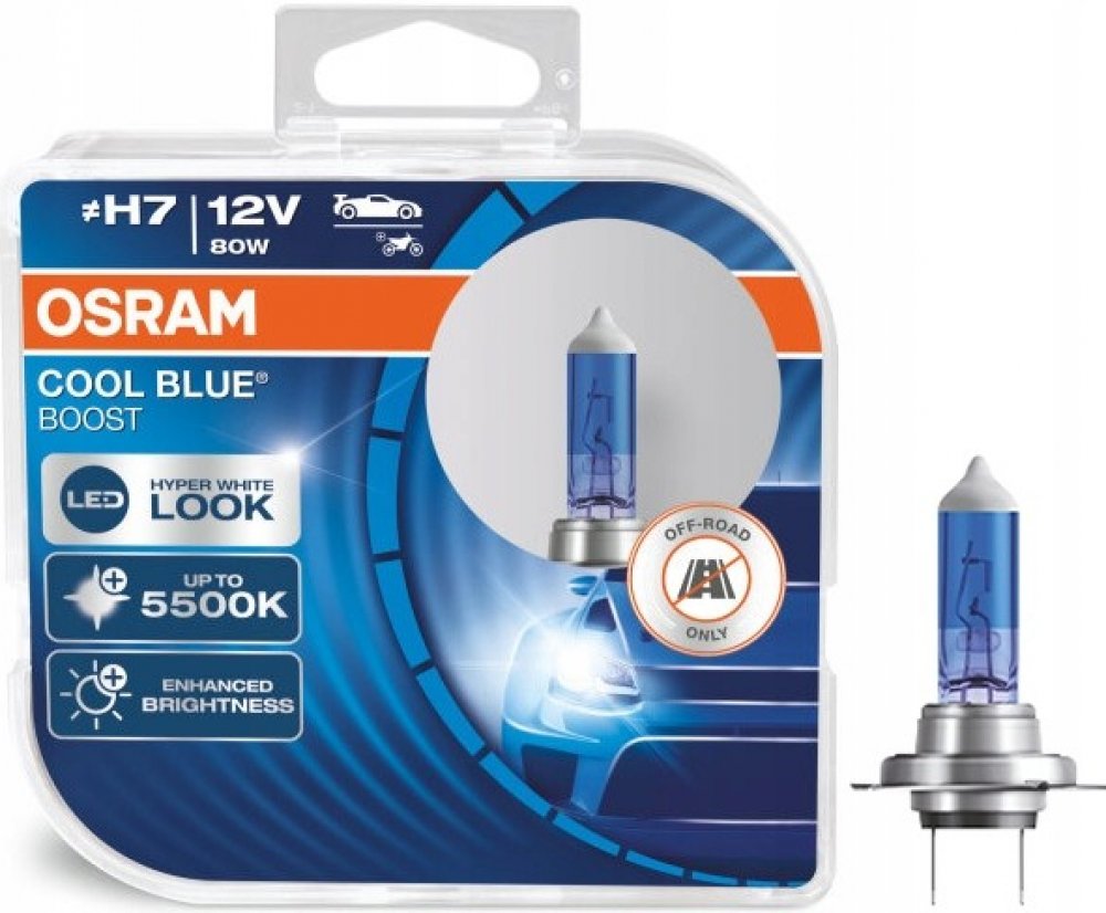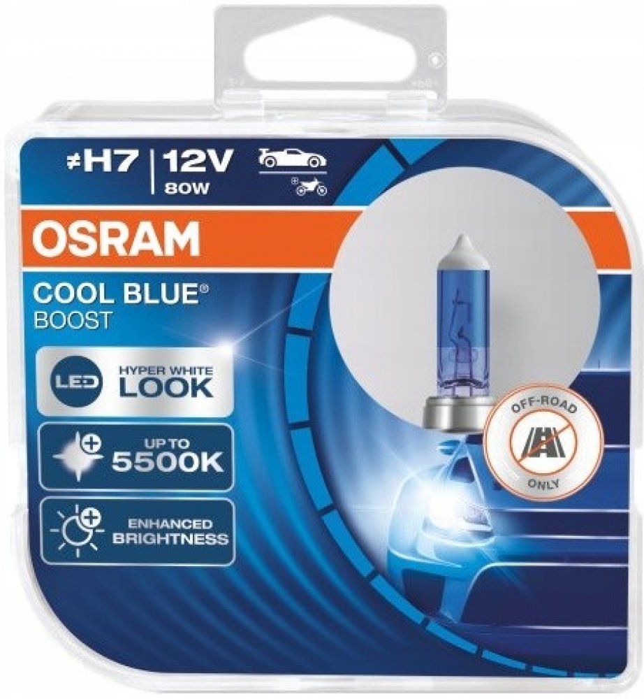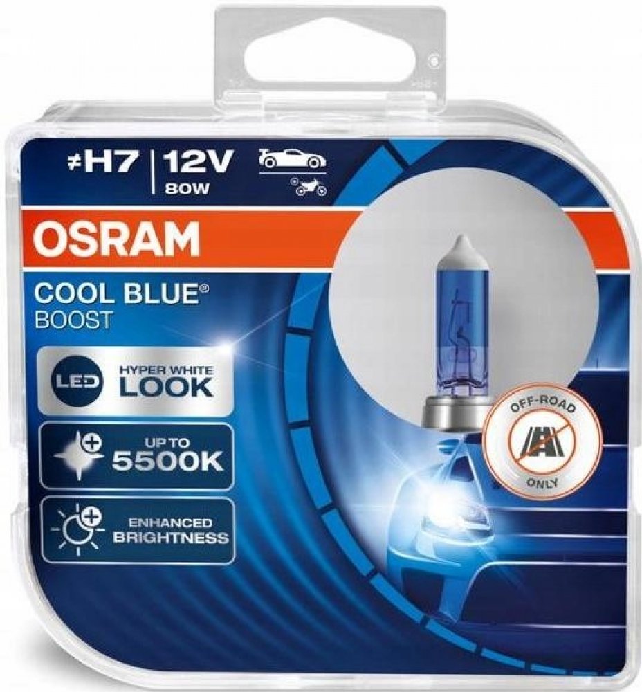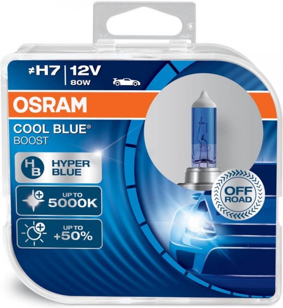 Žárovka OSRAM COOL BLUE BOOST s barevnou teplotou 5000°K vyzařuje jedinečně bílé světlo. Zvýšení jasu ve srovnání s konvenční žárovkou, usnadňuje rozlišovat značení a dopravní značky, což zvyšuje bezpečnost. Kromě toho, je barva 5000°K blízko denního světla a OSRAM COOL BLUE BOOST je příjemnější pro lidské oko a nemusí vést k únavě řidičem. Osram Cool Blue Hyper nabízí barevnou teplotu 5000°K, přináší stylové ledově bílé světlo na silnici. Tyto žárovky jsou UV filtrovány a proto je můžete používat s plastovými čočkami.