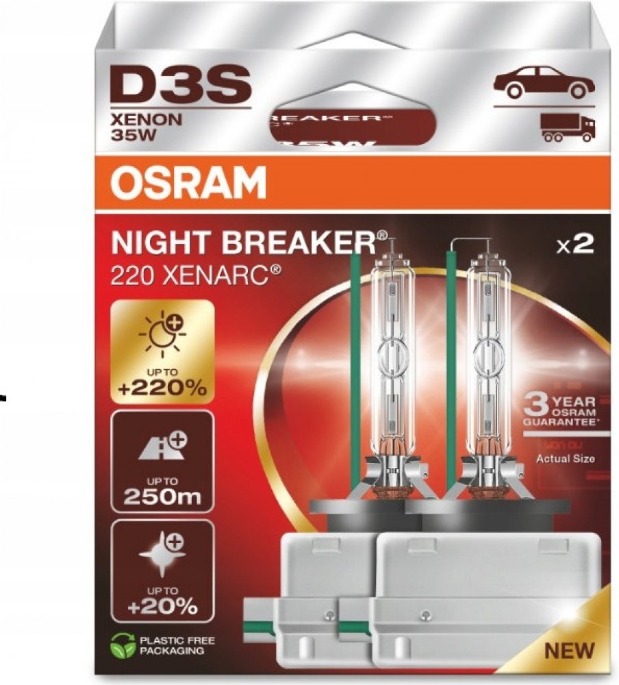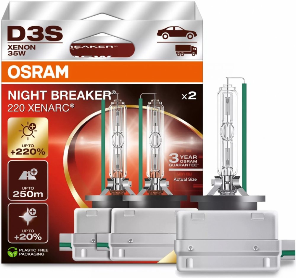 XENARC NIGHT BREAKER LASER jsou nejjasnější xenonové výbojky od společnosti OSRAM. Tyto mimořádně jasné xenony zajišťují mnohem lepší viditelnost na silnici: až o 220 % jasnější světlo ve srovnání s minimálními požadavky normy. Více světla a silnice osvětlená až 250 m před vozem umožňují vidět překážky a nebezpečí na silnici mnohem dříve a poskytují více času na reakci. A světlo je až o 20 % bělejší (ve srovnání s homologačním minimem) a dodává vozidlu moderní vzhled podobný těm, které představují auta s laserovými světlomety. Objevte výkon XENARC NIGHT BREAKER LASER – nejsilnějšího xenonového světla společnosti OSRAM. Produkty jsou k dispozici v typech: D1S, D2S, D3S a D4S. Upozornění: Doporučujeme vyměnit žárovky XENARC za páry kvalifikovanými mechaniky.