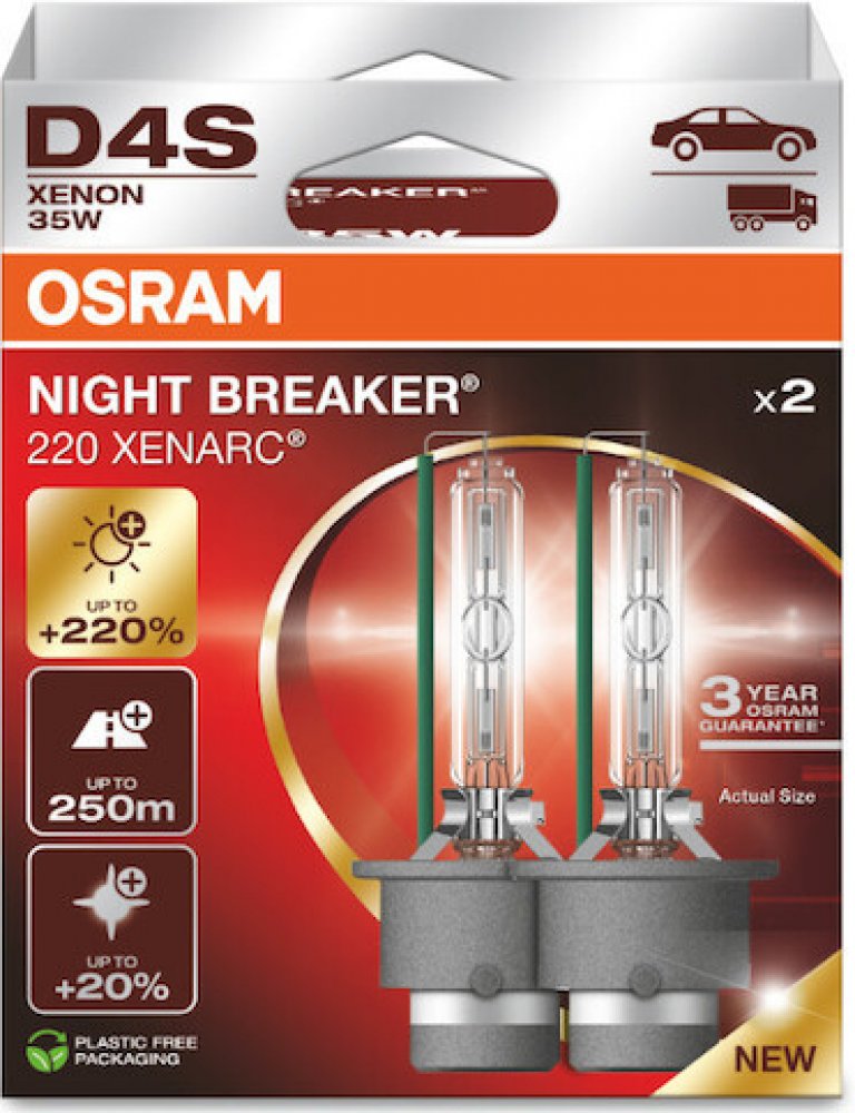Nejvýkonnější xenonové světlo OSRAM. XENARC NIGHT BREAKER 220 je nejjasnější xenonové světlo OSRAM. Tato výkonná žárovka s účinnou xenonovou technologií zajišťuje lepší viditelnost na silnici: až o 220 % vyšší jas ve srovnání s minimální zákonnou normou. K tomu se přidává až 250 metrů dlouhý paprsek a až o 20 % bělejší světlo pro modernější vzhled (ve srovnání s minimální zákonnou normou). Objevte čistý výkon XENARC NIGHT BREAKER 220 - nejvýkonnější xenonové světlo od OSRAM, dostupné v D1S, D2S, D3S a D4S. Upozornění: Výměnu výbojky XENARC se doporučuje provádět odborníkem a ve dvojicích. Balení 2HB obsahuje dvě výbojky.