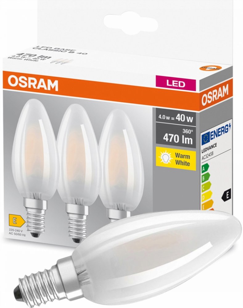 LED žárovka svíčková - patice: E14 • výkon: 4 W • ekvivalent: 40 W • světelný tok: 470 lm • Teplá bílá (2700K) • napětí: 220-240V • stmívatelné: ne • úhel paprsku: 3 mm • 3 mm: celková délka. Balení 3ks. Cena za balení.