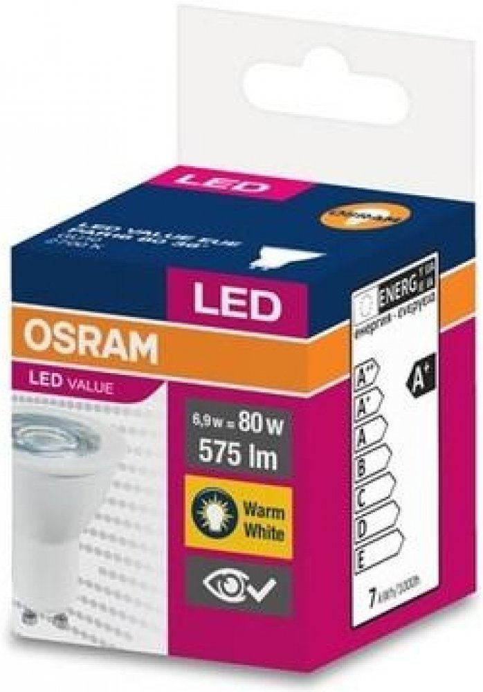 Osram LED Value PAR16 bodové světlo s objímkou GU10, světelným tokem 575 lm teplá bílá 2700 k a příkonem 6,9 W (ekvivalent klasické 80 W žárovky). Životnost tohoto bodového světla je až 15000 hodin.