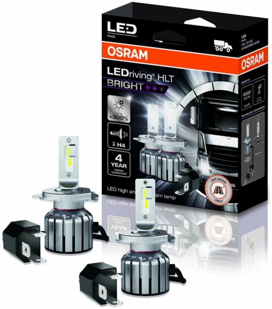Příkon: 15/15W, Patice: P43t/PU43t-3, Napětí: 24V, Tvar: H4 / H19, Technologie: LED, Barva světla: 6000KNáhrada LED H4 pro 24VNáhradní žárovky LEDriving HLT BRIGHT nabízejí moderní a intenzivní světlo s barevnou teplotou až 6 000 kelvinů. Tyto náhradní LED žárovky jsou vhodné pro běžné dálkové a potkávací světlomety H4. LEDriving HLT BRIGHT pro dálková a potkávací světla pro off-road jsou kompatibilní s napětím 24 V a vynikají mimořádným jasem, vysokou kompatibilitou, snadnější instalací díky integrovanému driveru a žádným rušivým rádiovým signálem. Na dvojici žárovek se vztahuje čtyřletá záruka OSRAM. Výrobky nemají schválení ECE a nesmí se používat na veřejných komunikacích ve vnějším osvětlení vozu. Použití na veřejných komunikacích můž vést k odebrání technického průkazu a ztrátě pojistného krytí.