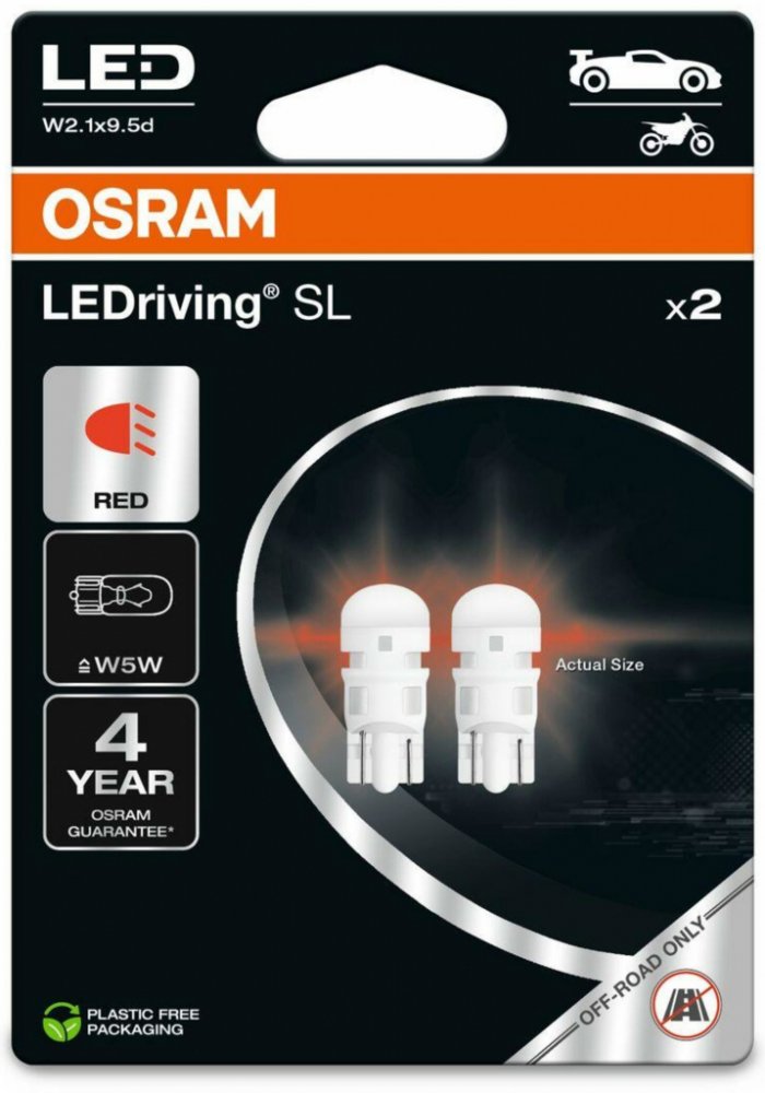 LED autožárovka OSRAM o výkonu 0,6 W poslouží jako náhrada obyčejné žárovky a je využitelná zejména na boční blinkry, přední parkovací světla (obrysová), osvětlení SPZ a osvětlení interiéru. Má nižší energetickou náročnost oproti klasické halogenové žárovce, což šetří baterii auta. Pracuje s napětím 12 V, a tak bude vyhovovat osobním automobilům. Jde o LED žárovku typu W5W s paticí W2,1x9,5d. V balení naleznete 2 LED autožárovky. Hlavní přednosti LED autožárovky OSRAM LEDriving SL W5W Červená 12V dva kusy v balení LED autožárovka OSRAM o výkonu 0,6 W se používá jako náhrada obyčejné žárovky Používá se jen pro off road účely, nedisponuje homologací Využijete ji na boční blinkry, přední parkovací světla (obrysová), osvětlení SPZ a osvětlení interiéru Jedná se o žárovku typu W5W s paticí W2,1x9,5d Funguje při napájecím napětí 12 V Generuje světelný tok 15 lm V balení obdržíte 2 LED autožárovky