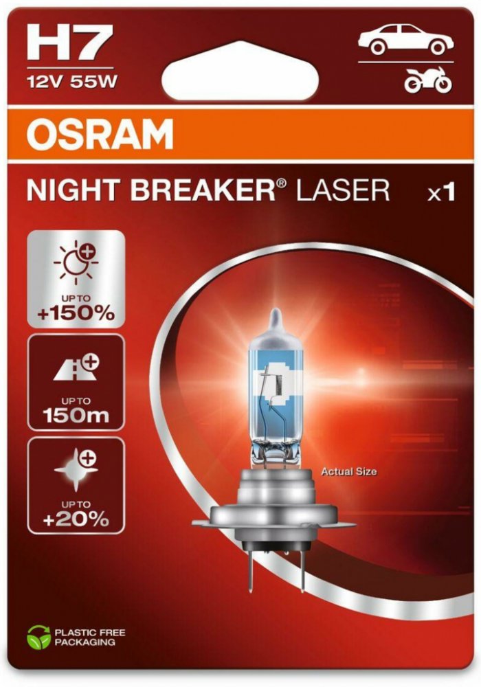 Pro ověření kompatibility použijte nástroj OSRAM.OSRAM H7 12V 55W NIGHT BREAKER LASER +150% – Halogenová autožárovka pro maximální výkon a bezpečnostObjevte špičkovou autožárovku OSRAM NIGHT BREAKER LASER H7 12V 55W PX26d, která přináší až o 150 % více světla oproti minimálnímu zákonnému standardu. Díky inovativní technologii laserové ablace a preciznímu vláknu získáte intenzivnější, delší a bělejší světelný paprsek.Tato žárovka je ideální volbou pro řidiče, kteří kladou maximální důraz na bezpečnost a komfort při nočních jízdách nebo za zhoršených podmínek.Klíčové vlastnosti OSRAM NIGHT BREAKER LASER H7 Až +150 % více světla – výrazně lepší osvětlení vozovky před Vámi. Dlouhý paprsek – světelný kužel dosahuje až 150 metrů, což zvyšuje čas na reakci při nečekaných situacích. Až o 20 % bělejší světlo – lepší kontrast a komfort pro oči, méně únavy při řízení v noci. Originální design – laserem gravírovaný název produktu na baňce jako záruka pravosti a kvality. Univerzální použití – vhodné pro osobní automobily i motocykly, patici H7 (PX26d). Kompletní portfolio – dostupné také v dalších populárních typech (H1, H3, H4, H8, H11, HB3, HB4).Technické parametry Typ: H7 Příkon: 55 W Napětí: 12 V Patice: PX26d Barva světla: Bělejší světlo (oproti standardu) Balení: 1 kus (blistr)Pro koho je žárovka NIGHT BREAKER LASER určena?Tento typ autožárovky doporučujeme především náročným řidičům, kteří často jezdí v noci nebo za špatných povětrnostních podmínek a chtějí zvýšit svou bezpečnost i pohodlí. Skvělá volba také pro ty, kdo hledají nejmodernější technologie a originální design v oblasti automobilového osvětlení.Trust badges & garance Certifikace: CE Původní výrobce OSRAM – záruka kvality a inovaceNejčastější dotazy (FAQ) Lze tuto žárovku použít do všech typů světlometů s paticí H7? Ano, žárovka je určena pro všechny světlomety kompatibilní s paticí H7 (PX26d), vždy však doporučujeme ověřit kompatibilitu v manuálu Vašeho vozu. Je potřeba měnit žárovky v páru? Pro dosažení rovnoměrného osvětlení a bezpečnosti doporučujeme měnit vždy obě žárovky najednou.Doporučení interiérů: Výrazně lepší viditelnost a jasnější světlo zvyšují nejen bezpečnost, ale také komfort při každodenním řízení. Investujte do svého bezpečí s technologií OSRAM NIGHT BREAKER LASER!