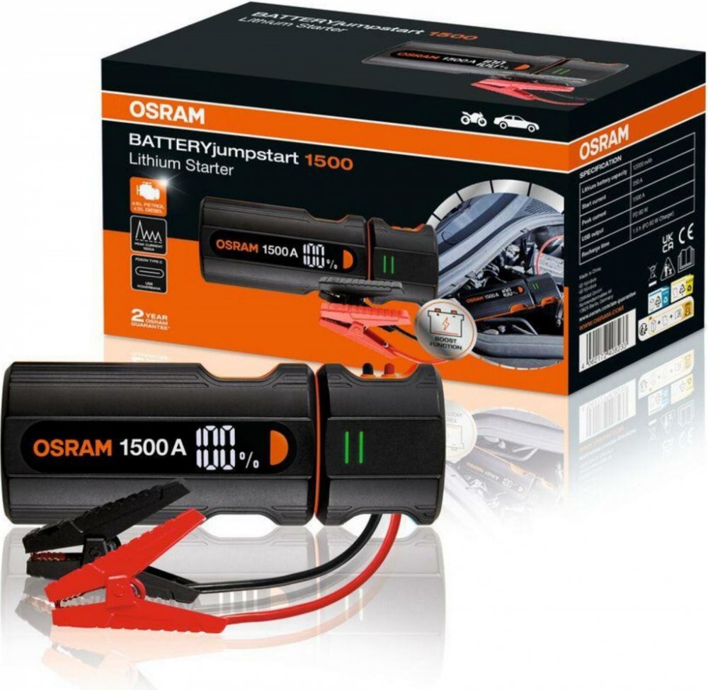 Sháníte spolehlivý zdroj pro nouzové nastartování auta i rychlé dobíjení elektroniky? OSRAM BATTERYjumpstart 1500 kombinuje výkonný lithium-iontový startér (až 1500 A) s moderní powerbankou PD 60 W. Díky inteligentní svorce, pokročilé ochraně a kompaktním rozměrům je ideálním parťákem na cesty pro osobní vozy, dodávky, SUV i lehké užitkové vozy.