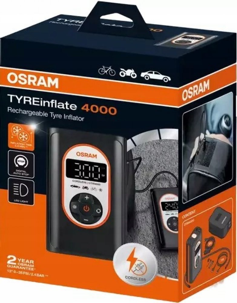 OSRAM TYREinflate 4000 – Nabíjecí digitální kompresor na pneumatikyObjevte kompaktní a výkonný OSRAM TYREinflate 4000 – ideální řešení pro rychlé a pohodlné huštění pneumatik nejen na cestách. Tento bezdrátový, dobíjecí kompresor je osazen kvalitní Li-Ion baterií, která zajišťuje maximální mobilitu a svobodu použití, ať už jste na dovolené, při kempování nebo během běžného provozu.Klíčové vlastnosti a výhody Rychlost huštění – pneumatiku nafouknete už za 3,5 minuty. Bezdrátový provoz – integrovaná Li-Ion baterie umožňuje použití bez potřeby napájecího kabelu. Automatické zastavení – kompresor sám vypne huštění při dosažení nastaveného tlaku. Podsvícený LED displej – přehledně zobrazuje aktuální tlak a nastavení, což oceníte i za snížené viditelnosti. Integrované LED světlo – usnadňuje použití ve tmě nebo v nouzových situacích. Paměť pro 4 vozidla – snadné uložení a vyvolání nastavení tlaku pro několik vozidel. Vypouštěcí ventil – snadné a přesné regulování tlaku v pneumatice.Proč zvolit OSRAM TYREinflate 4000?Díky nabíjecí baterii a kompaktním rozměrům je tento digitální kompresor perfektním doplňkem do každého vozu, garáže či karavanu. Skvěle se hodí pro huštění pneumatik automobilů, motocyklů, jízdních kol i sportovního vybavení. Oceníte rychlost, přesnost i intuitivní ovládání. OSRAM TYREinflate 4000 představuje bezpečí a komfort v každé situaci, kdy potřebujete rychle a spolehlivě zkontrolovat nebo upravit tlak v pneumatikách.Trust badges & garance Certifikace: CEFAQ – Často kladené otázky Jak dlouho trvá nabití baterie? Plné nabití obvykle trvá několik hodin, doporučujeme nabíjet kompresor po každém použití, aby byl vždy připraven k akci. Lze kompresor použít i pro huštění míčů nebo nafukovacích hraček? Ano, v balení najdete i adaptéry pro různé typy ventilků, takže snadno nafouknete i sportovní vybavení. Doporučení designéra: Díky kombinaci moderního digitálního displeje, robustního provedení a nadstandardní výdrže baterie je OSRAM TYREinflate 4000 vhodný jak pro každodenní použití, tak pro náročné cestovatele a rodiny, které chtějí mít jistotu správného tlaku v pneumatikách kdykoliv a kdekoliv.