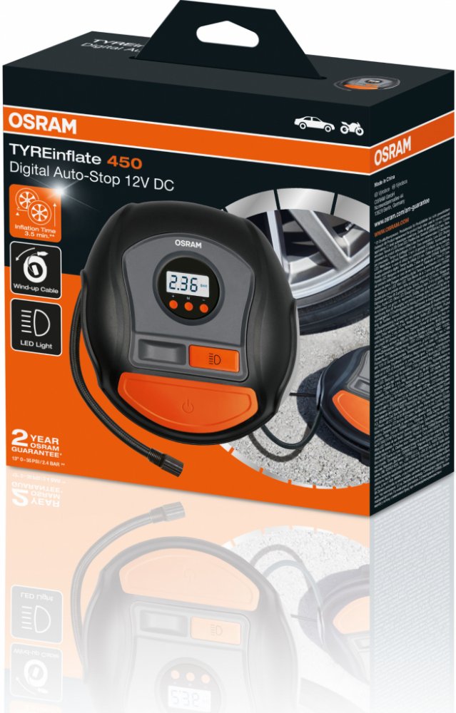 Kompresory OSRAM jsou flexibilní, snadno použitelné a všestranné. Ať už jste doma v garáži, na parkovišti, na ulici, na dovolené nebo na služební cestě: kompresory jsou užitečné, lehké a díky svým kompaktním rozměrům snadno skladovatelné. Jsou napájeny z 12V zásuvky ve vozidle. Mají integrovaný napájecí kabel s navíjecím mechanismem a flexibilní vzduchovou hadici. Doba nafukování pneumatik je velmi krátká, tlak se zobrazuje ve třech různých jednotkách tlaku bar, kPA a PSI. Součástí je přihrádka na víčka ventilů pneumatiky, velké tlačítko pro zapnutí/vypnutí. S kompresory se velmi snadno manipuluje bez potřeby dalších nástrojů.
