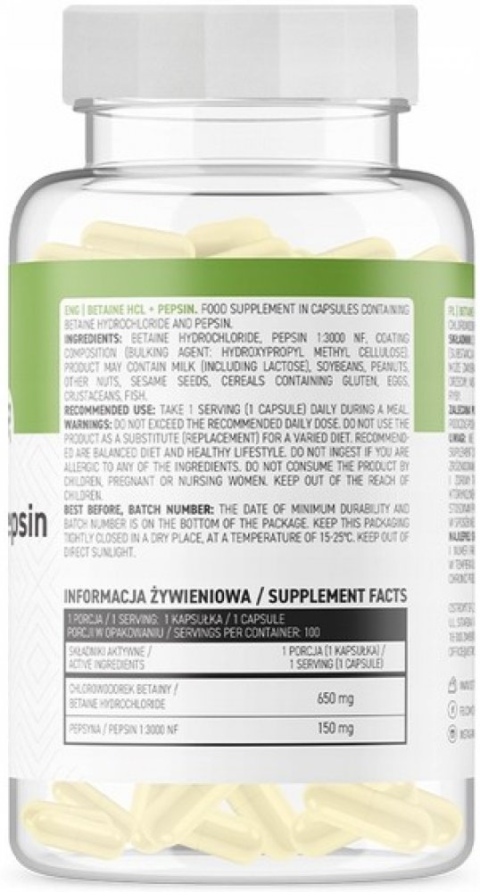 - KOMPLEXNÍ PODPORA TRÁVICÍHO SYSTÉMU - Betain reguluje hladinu kyseliny chlorovodíkové v žaludku, zatímco pepsin je zodpovědný za rozklad a trávení bílkovin. Při společném použití podporují proces trávení a vstřebávání živin z potravy.