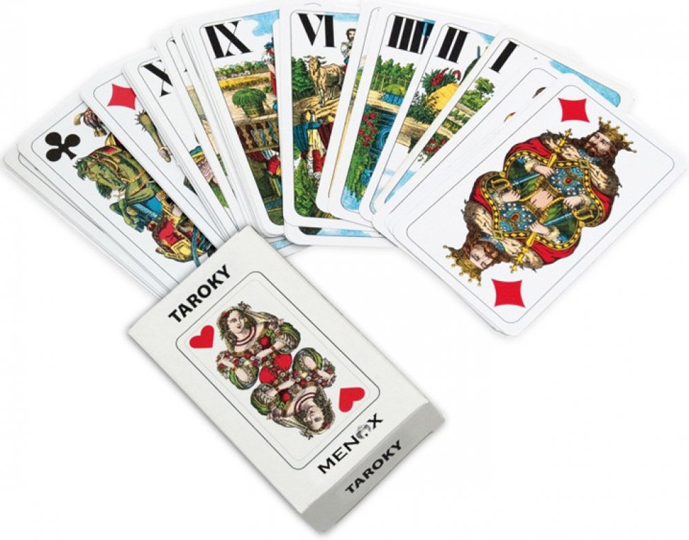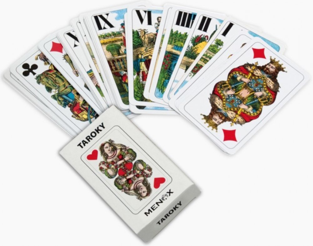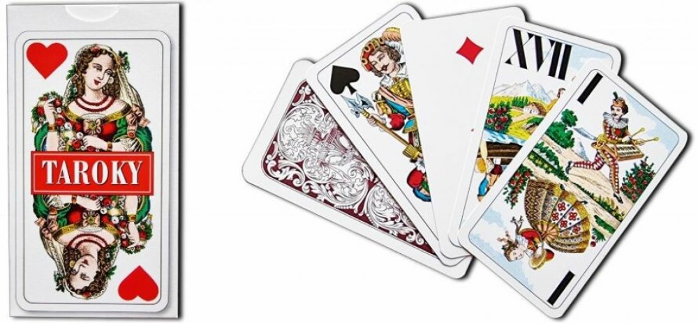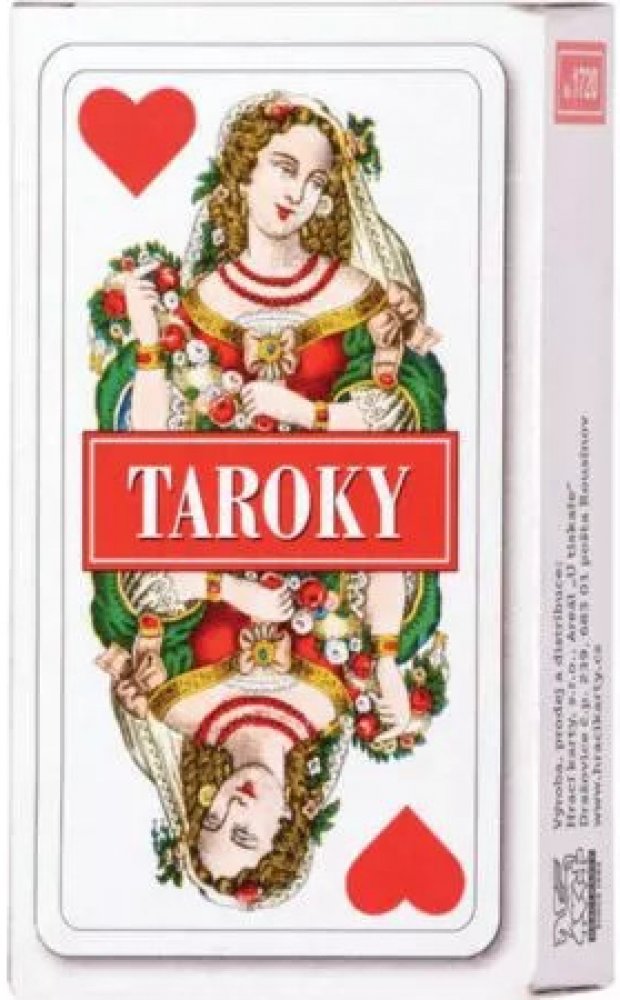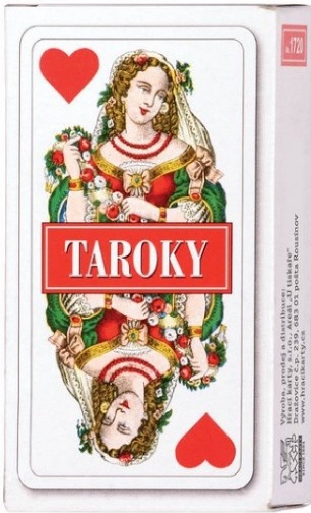 Karty Taroky papírová krabička. Karty se žánrovými obrázky ze života patří k nejoblíbenějším z rodiny karet typu „Industrie & Glück“, která si svoji popularitu udržuje již 150 let. Tvář těmto kartám dal výtvarník Josef Neumayer. Historický revers se stylizovanými vázami patří u tarokových her ke klasickým a do dnešních dnů neztratil nic na své popularitě.