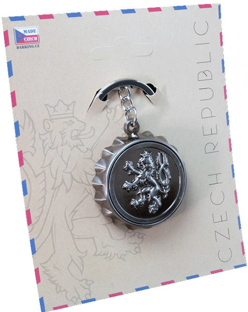Kovový otvírák ve tvaru zátky od piva. Se symbolem Českého lva.Na řetízku s karabinou. Lze tak např. připnout na opasek.
