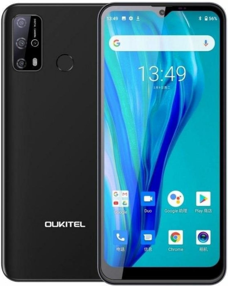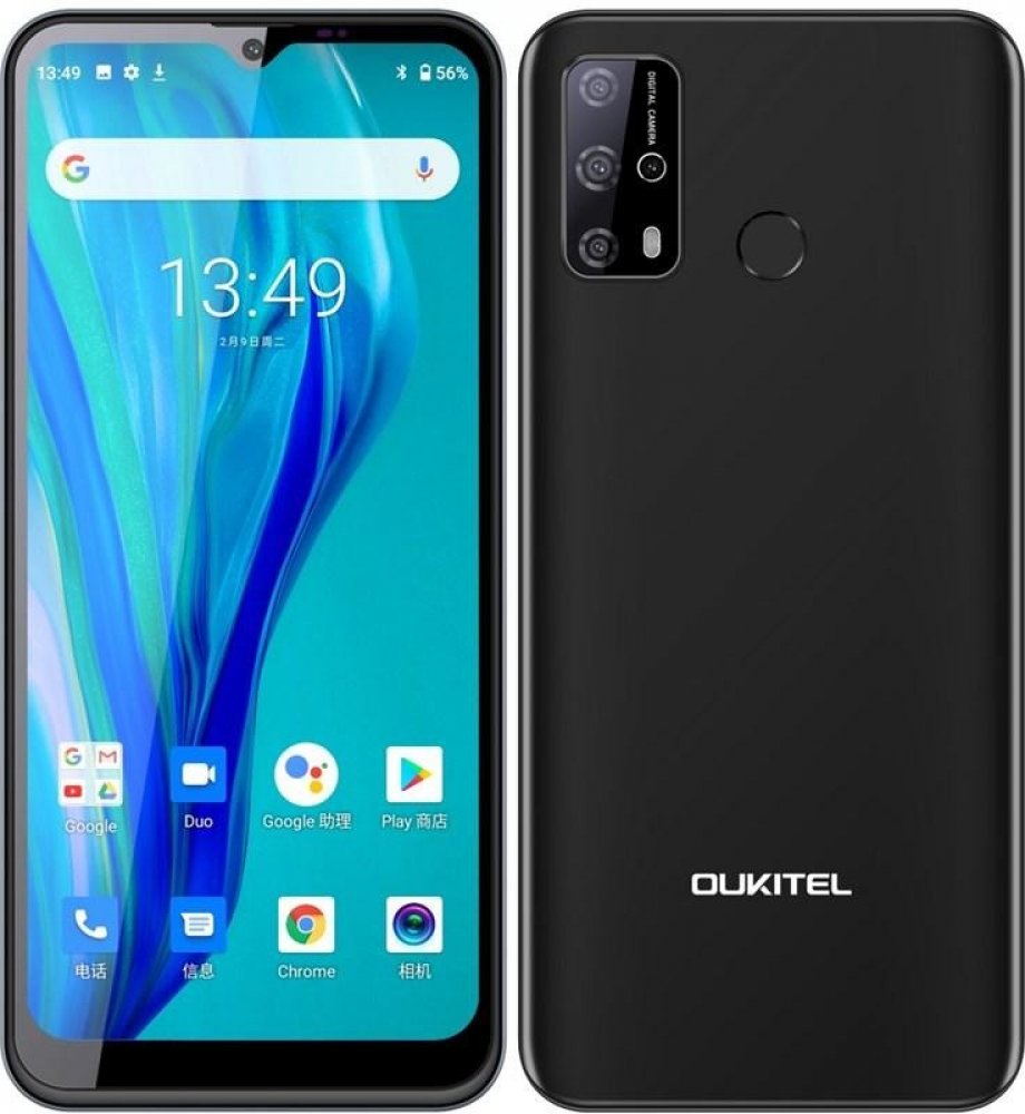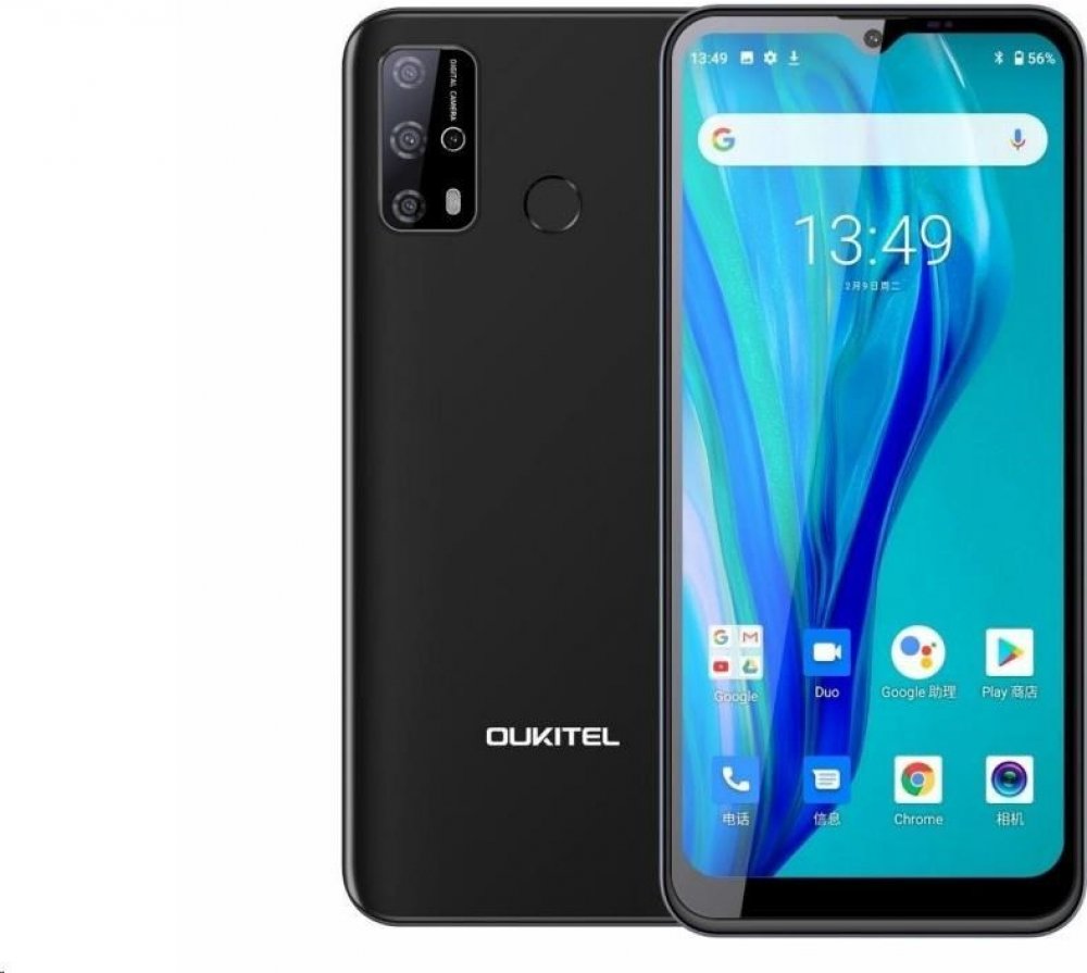 Chytrý telefon, 6.53" HD+ Incell displej, 1600 x 720, Octa-core, 4GB + 64GB, zadní triple kamera 13Mpx + 2 MPx + 0.3 Mpx, přední kamera 8 MPx, Dual SIM, 4G/LTE, GPS + Galileo + Beidou, snímač otisku prstů, baterie 5000 mAh, FaceID, Android 10, černá barva, silikonové pouzdro v balení