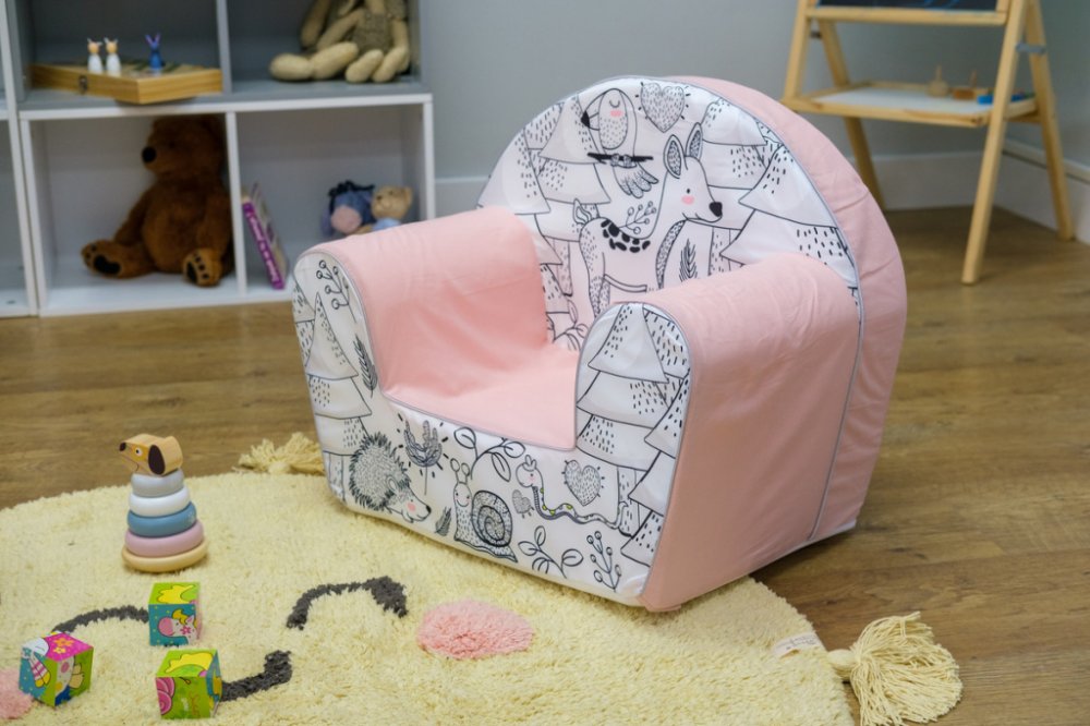 Barevné křesílko s motivem kolouška a lesních zvířátek. Kombinace růžové látky a černobílého potisku je vhodná do dívčího pokojíku. Dětské křesílko je vyrobeno z měkoučké a lehounké pěny. Díky tomu máte jistotu, že je bezpečné a praktické pro každodenní používání.