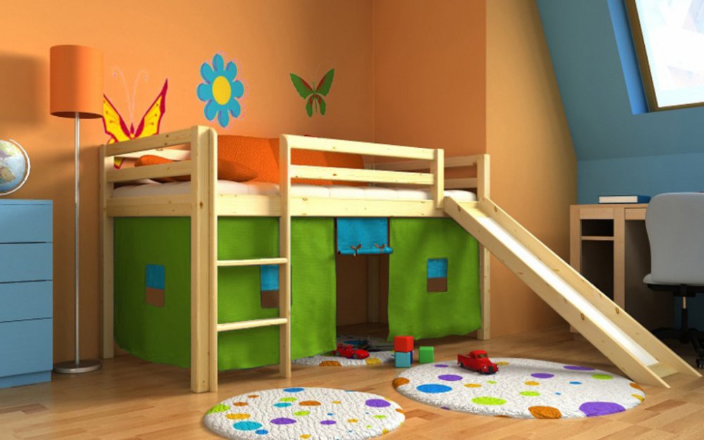 - Uspořádání prostoru pod vyvýšenou postelí nechejte na dětské fantazii.