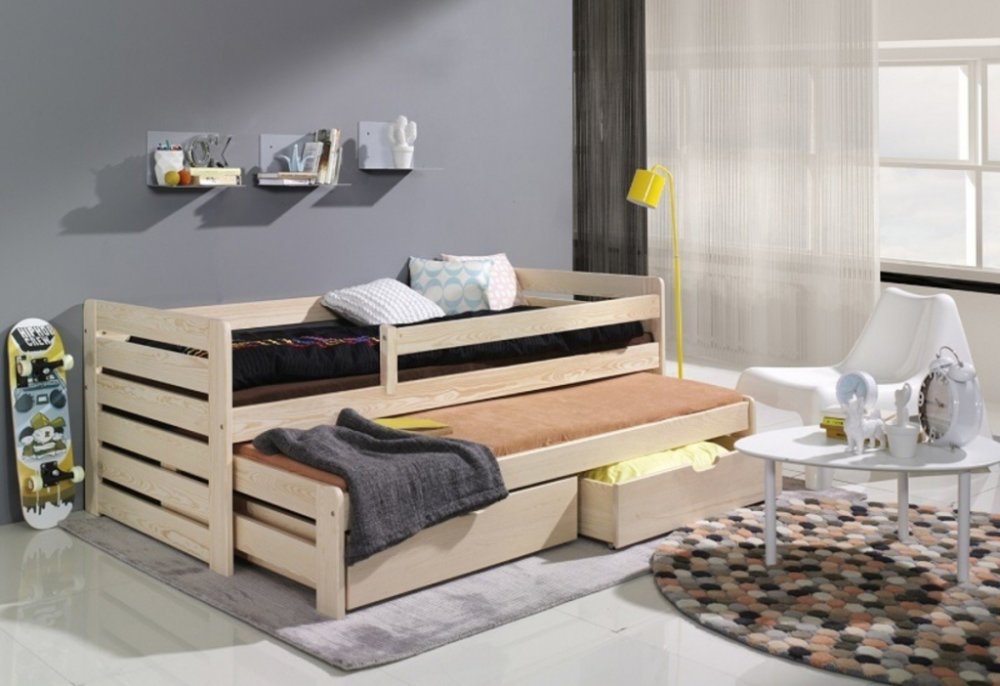 Dřevěná postel Praktik s přistýlkou je nadstandardně vybavená.