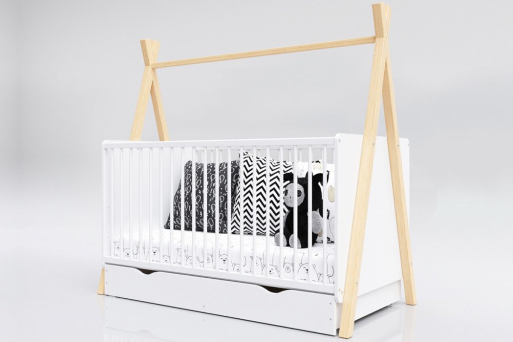 Bílá dětská postýlka Teepee o rozměru 140x70 cm. Postýlka je ve skandinávském stylu, který je v dětském pokoji velmi populární. Postýlka je k dispozici ve variantách s úložným prostorem nebo bez. Vhodná pro děti od narození až do výšky 120 cm.