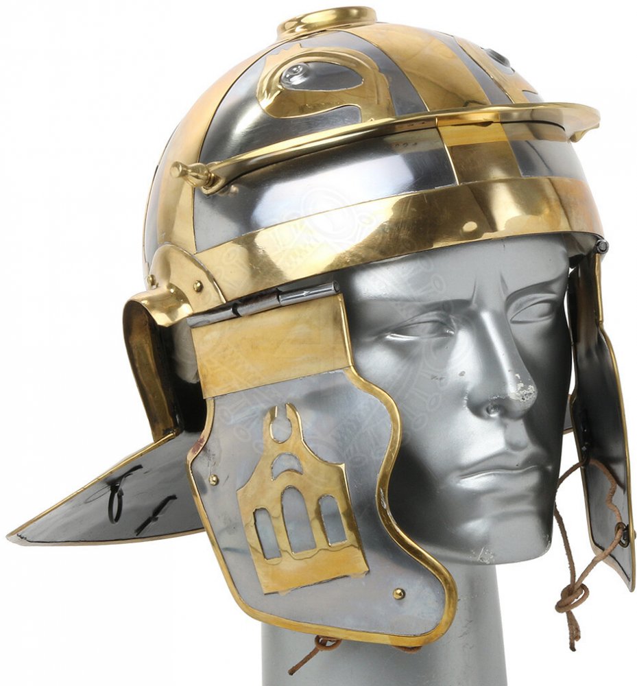 Imperiální Italická přilba „D“ typ Krefeld, železo a mosaz, 2 stol.n.l. Typ HR Robinson: Imperial Italic D Kontinentální klasifikace: typ Weisenau-Krefeld Přilba jedinečným způsobem kombinuje různé stylové prvky: "Oči" ozdoby se zvýšenými zřítelnicemi (jak již bylo známo u předřímských přileb), elementární zvednuté linky obočí (stejně jako u Imperial-galských typů) a křížové výztuhy typů Imperial Italic. Chrániče krku s hranatými ornamenty, madlo a "Tabula ansata". Na těžce poškozeném originálu se nedochovaly lícnice, tyto byly rekonstruovány podle Imperiální Italické přilby D z Worms a podle chrámové ozdoby z Venlo - Nizozemsko. Určení doby vzniku: Vzhledem ke stylovým prvkům přilba nejspíše vznikla v druhém století našeho letopočtu. Použití kolem konce 1. století je také možné. Originál je samostatným nálezem bez dalších datovatelných nálezů v přímé souvislosti. V tomto ohledu nemůže být doloženo, že ke ztrátě přilby došlo již během vzpoury Batavů. Tento model je výsledkem nákladné rekonstrukce a intenzivní mezinárodní spolupráce v režii Deepeeka. Mohla tak vzniknout replika propracovaná do nejmenších detailů. Materiál: železo a mosaz Dodávka včetně vnitřní bavlněné výstelky. Vhodné na obvod hlavy do 60cm. Podélný vnitřní rozměr (čelo-týl): 21cm Příčný vnitřní rozměr (od ucha k uchu): cca 19,5cm Hmotnost: cca 1,9 kg