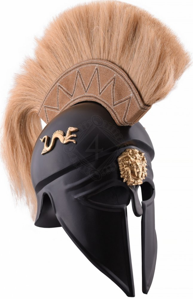 Italo-korintská přilba s chocholem černěná, zdobená Korintská přilba vznikla v 7. století př. n. l., dodnes charakterizuje podobu typické řecké přilby. Jeho původ sahá až do města Korint. Rychle se stala nedílnou součástí řecké zbroje hoplítů a rozšířila se do Itálie, kde se s několika úpravami používala jako jedna z nejběžnějších přileb v armádě římské republiky. Tato přilba je bohatě zdobena: po stranách zvonu najdete mýtické bytosti (zřejmě směs koně a hada), na čele mosazná podobizna hlavy medůzy. Součástí dodávky je velký, světlý chochol, který se připevňuje pomocí kovových destiček připevněných k přilbě. V ceně je i polstrovaná čepka. Materiál: konstrukční ocel Vhodné na obvod hlavy do cca 61cm Hloubka helmy (od týlu po čelo): cca 22cm Vnitřní šířka (od ucha k uchu): cca 20cm Hmotnost: cca 1660 kg (bez chocholu), cca 2060 g (s chocholem) Výše uvedené údaje se mohou exemplář od exempláře mírně lišit.