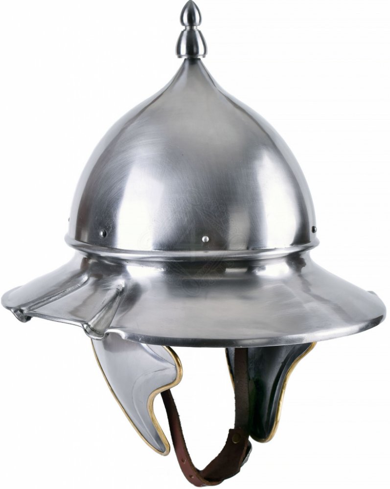 Keltská přilba, cca 1. stol. n .l. Ke špičce helmy se pravděpodobně připevňovaly koňské žíně. Helma má pohodlnou koženou výstelku a řemen pod bradu. Specifikace výrobku: Materiál: ocel 1,6mm Velikost: vhodná na obvod hlavy do 62cm Hloubka helmy (od týlu po čelo): cca 22cm Vnitřní šířka (od ucha k uchu): cca 16,5cm Hmotnost: cca 1,9 kg