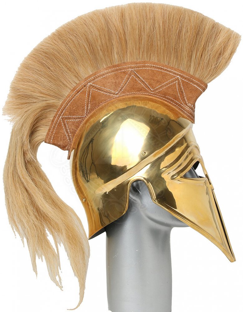 Korintská přilba s chocholem, starověká řecká přilba Vhodné na obvod hlavy do 61cm. Podélný vnitřní rozměr (čelo-týl): cca 22,5cm Příčný vnitřní rozměr (od ucha k uchu): cca 17cm Síla materiálu: 1,3mm Vyrobeno z mosazi Dodávka cčetně chocholu Hmotnost: cca 1,65 kg (bez chocholu), cca 2,10 kg (s chocholem)