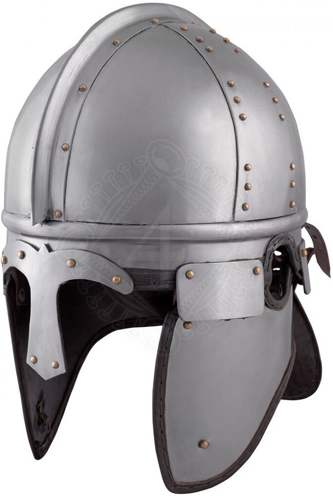 Pozdně románská žebrová přilba Castle Burgh Tato přilba je typická pro přechod pozdní antiky do raného středověku. Skládá se ze čtyř částí, které jsou spojeny navzájem spojeny sponkami a hřebenem. Lícnice jsou pohyblivé a zevnitř potažené kůží. Též a týlní štít je potažený kůží. Vpředu je helma vybavena mosazí nýtovaným krátkým nánosníkem. Přilba má pohodlnou koženou výstelku. Lícnice lze pomocí k...