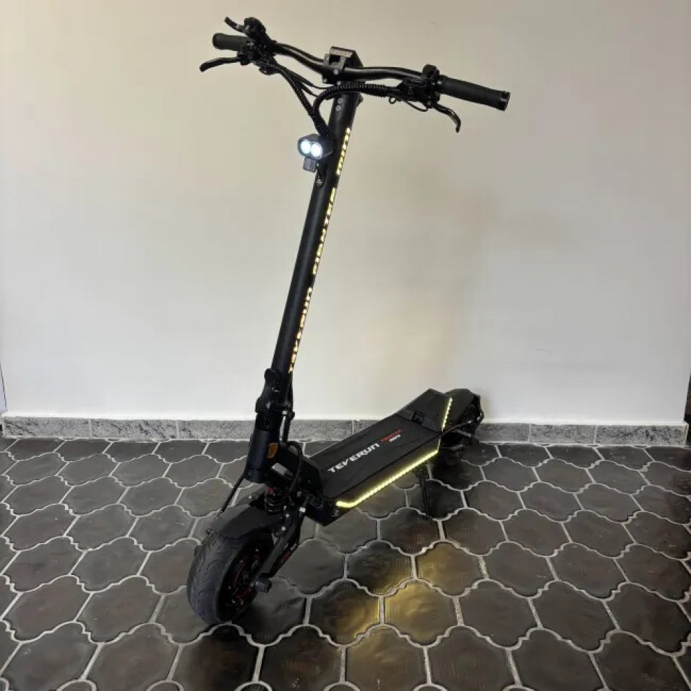 Teverun 2000 W 33 kg 150 kg 60 km/h 50 km pro intenzivní každodenní použití (60+ km) třída moped IPX5 pro terénní jízdu a hrubé povrchy 254 mm bezdušové pneumatické hydraulické kotoučové 118 x 60 x 65 cm vhodné pro přepravu vozidlem (nad 20 kg) vhodné pro nákupy a tašky