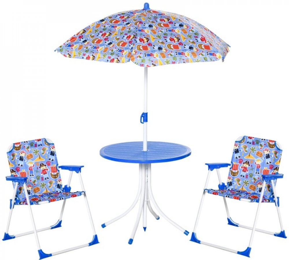 4DÍLNÁ SADA: Sada obsahuje kulatý stůl, dvě pohodlná křesílka a slunečník. Roztomilý motiv pirátů vaše děti jistě zaujme