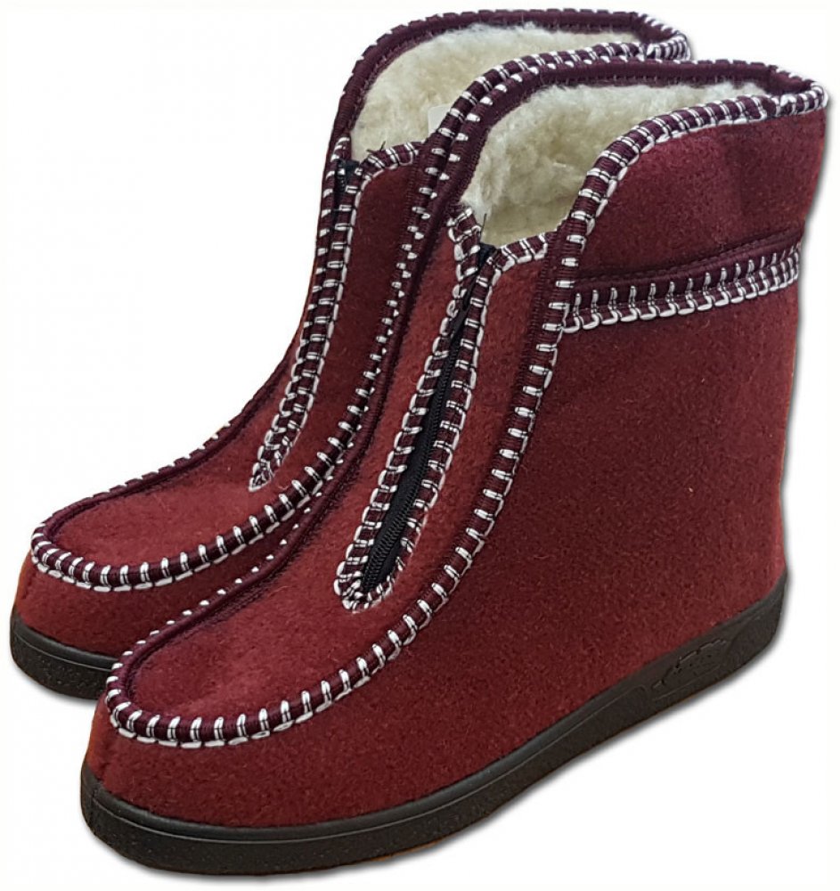 Důchodky vínové s ovčí vlnou jsou vhodné pro nošení jak ve vnitřním, tak i ve venkovním prostředí, především díky pevné protiskluzové podrážce. Důchodky jsou vhodné i pro oteklé nohy se zvýšeným nártem. Důchodky mají vnitřní část z ovčí vlny a venkovní je filcová. Zapínání je opatřeno zipem.