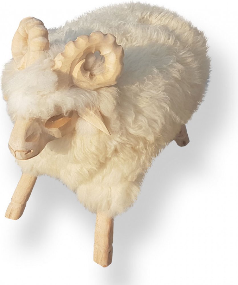 Stolička beran je vyřezaná z bukového dřeva a potažená na sedací části pravou ovčí kožešinou. Každý kus je originál – barevnost kožešiny se snažíme klientovi přizpůsobit. Foto ilustrační, může se mírně lišit.Materiál: korpus stoličky bukové dřevo