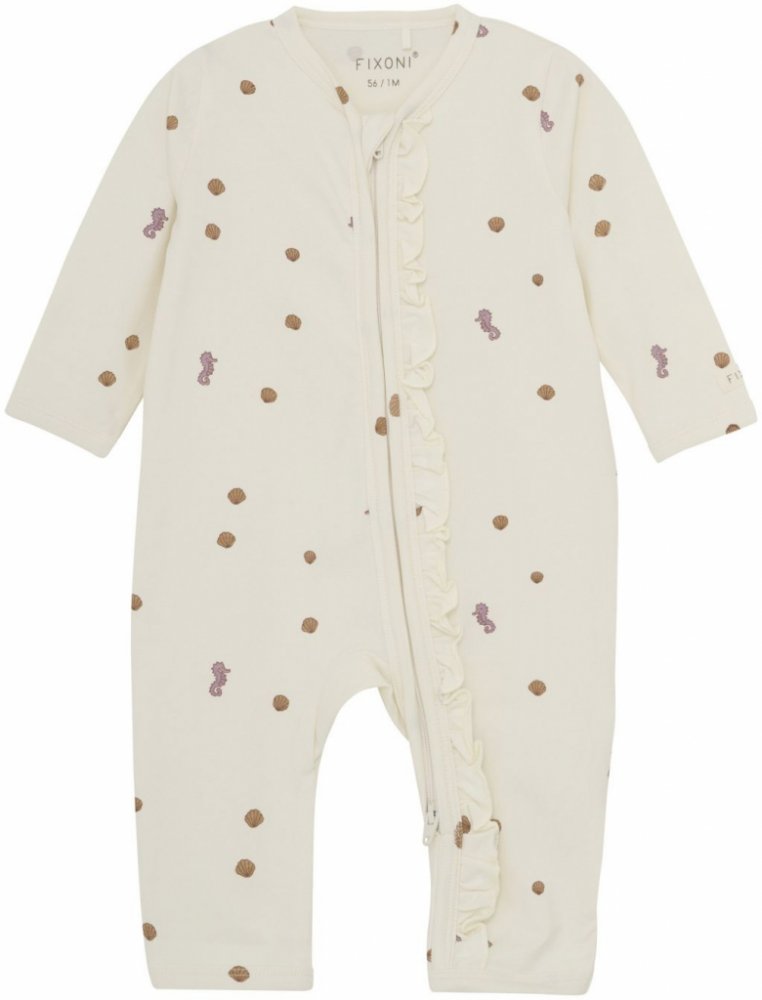 Overal značky Fixoni se zapínáním na oboustranný zip po celé délce. Overal má jemný celoplošný potisk s mořskými koníky a mušličkami a je vyrobeno z organické bavlny. Měkký a pružný materiál nabízí pohodlí a volnost pohybu. Tento overal patří do sezónní kolekce, která se vyznačuje tou nejvyšší kvalitou a jedinečným vzorem.