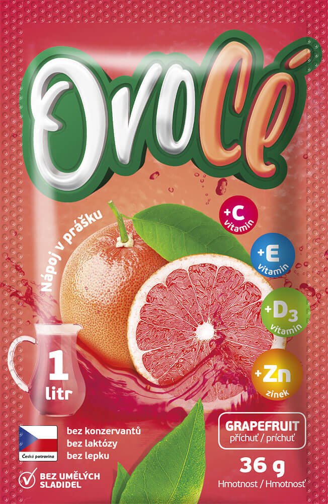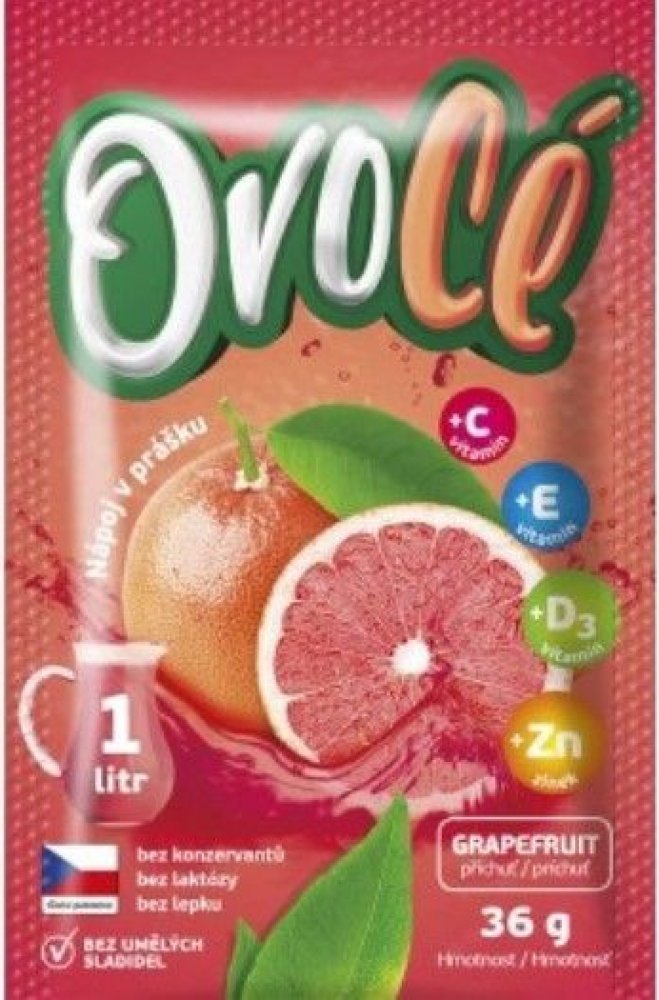 OvoCé rozpustný osvěžující vitaminový nápoj s příchutí grepu. Se sladidlem a cukrem.V 1 l nápoje (v 1 sáčku) je 150 doporučené denní dávky:ZnkuVitaminu C, E a D3Nápoj NEOBSAHUJE:KonzervantyLepekLaktozuSladidlaSložení:cukr, kyselina kyselina citronová, přírodní aroma, vláknina inulin, vitamin C (kyselina L-askorbová), barvivo betalainová červeň, vitamin E (DL-alfa-tokoferolacetát), zinek (citrát zinečnatý), vitamin D3 (cholekalciferol).Výživové údaje v 1 sáčku / ve 100 ml nápoje:energetická hodnota 612 kJ =144 kcal / 61 kJ = 14 kcal, tuky (z toho nasycené mastné kyseliny) 0 g (0 g) / 0 g (0 g), sacharidy (z toho cukry) 34 g (34 g) / 3,4 g (3,4 g), vláknina 0,3 g / 0,03 g, bílkoviny 0 g (0 g) / 0 g (0 g), sůl 0 g (0 g) / 0 g (0 g);vitamin C 120 mg (150 ) / 12 mg (15 ), vitamin E 18 mg (150 ) / 1,8 mg (15 ), vitamin D3 7,5 g (150 ) / 0,75 g (15 ), zinek 15 mg (150) / 1,5 mg (15 ). RHP referenční hodnota příjmu pro průměrnou dospělou osobuNávod na přípravu: Obsah sáčku rozpusťte v 1 litru studené vody. Doporučen