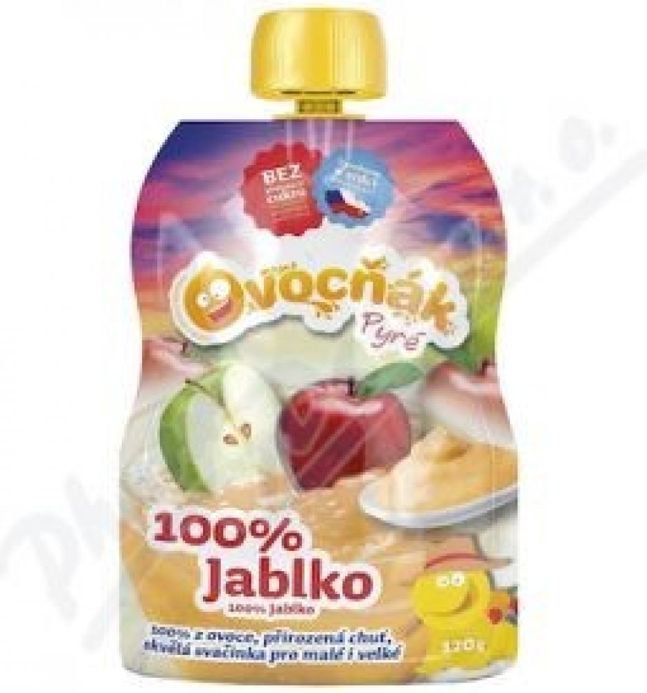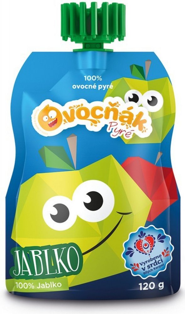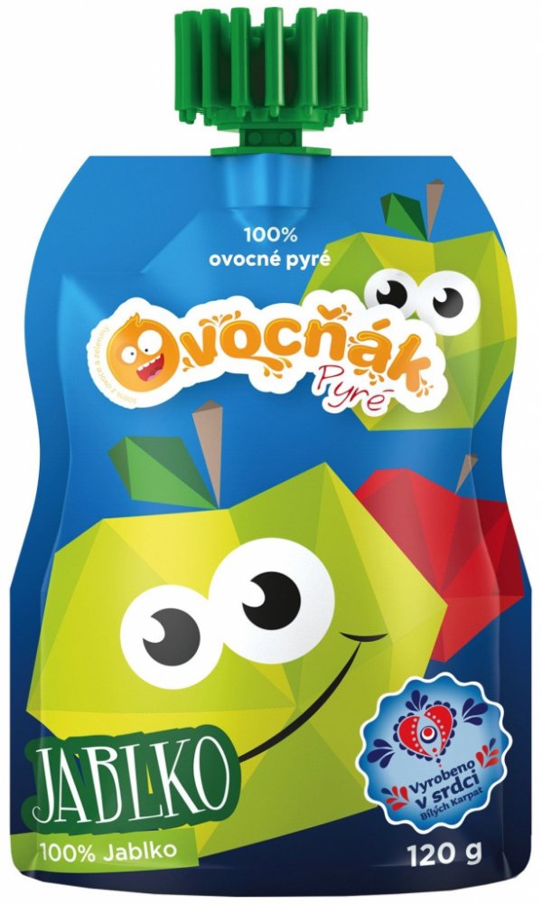 Toto ovocné pyré obsahuje čistý protlak z jablek bez přidaného cukru či jiných přísad v praktické kapsičce. Ovoce je pro výrobu pečlivě vybíráno, pochází z certifikovaných sadů a od prověřených pěstitelů. Na těchto 120 g bylo zpracováno 160 g čerstvých jablíček. Je vhodné pro kojence od dokončeného 5. měsíce věku. Chuť a barva se může lišit v závislosti na odrůdě surovin a ročním období. Kapsičku můžeme přibalit také dětem do školy jako zdravou svačinku. Každé víčko kapsiček Ovocňák je dílek stavebnice. Posbírejte je a pusťte se do hry. Začněte skládat, spojovat a kombinovat. Své výtvory pak můžete vyfotit a pochlubit se jimi. Společnost Ovocňák pravidelně vyhlašuje soutěže o nejkreativnější výtvory, které oceňuje věcnými cenami.