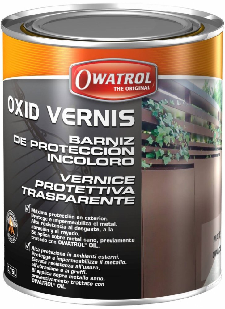 OWATROL OXID VERNIS® je jednolitý čirý UV odolný lak obohacený alkydovými pryskyřicemi a modifikovaným polyuretanem pro použití na nové nebo zoxidované kovy, které byly dříve ošetřeny produktem OWATROL OIL® u kterých je vyžadováno udržování přirozeného vzhledu povrchu.