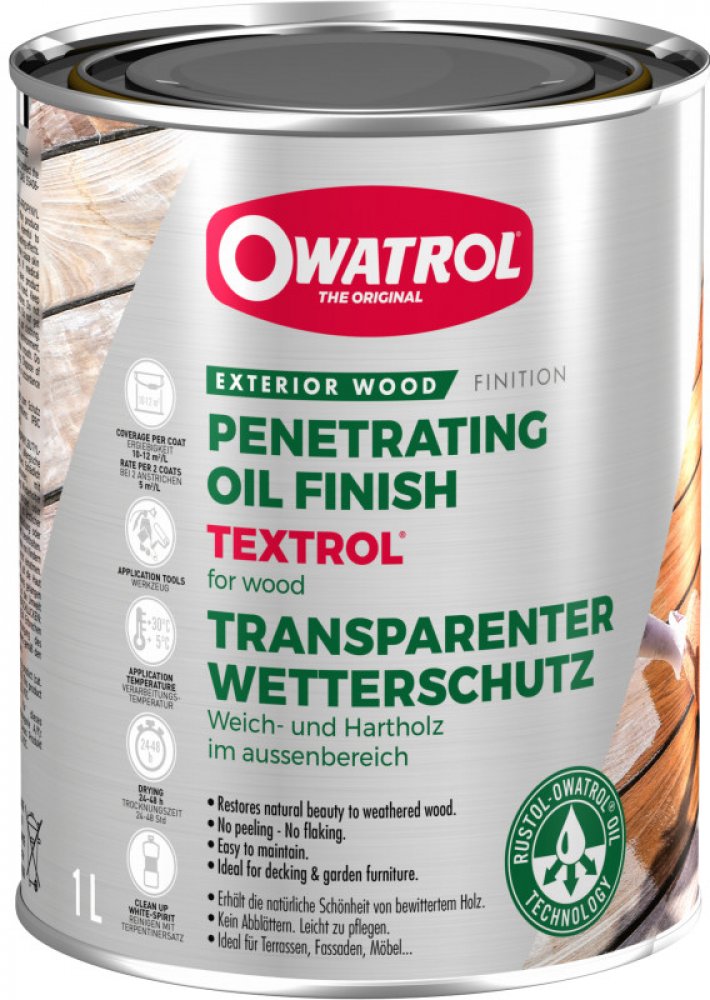 OWATROL TEXTROL® je penetrační olejový finální nátěr, který je určen k revitalizaci počasím ošlehaných, vyschlých teras a venkovního dřeva. OWATROL TEXTROL® obnovuje sytý teplý vzhled a krásu přírodního venkovního dřeva. Byl vyvinut k pronikaní hluboko do dřeva čímž ho chrání proti poškozeni vlhkostí a UV paprskům.