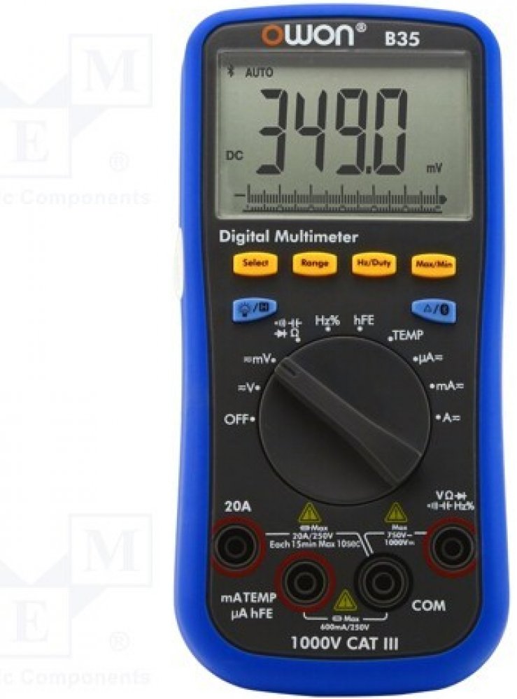 Univerzální digitální multimetrVlastnosti:PojistkaAutomatický rozsahTest diodAkustický testData HoldIndikátor baterieAnalog Bargraf BluetoothParametry:-DC napětí 60.00mV/600.0mV 0.01mV ±(0.5%+2dig) V 60.00mV/600.0mV/6.000V/60.00V 0.1mV 600.0V/1000V 0.1V-AC napětí 60.00mV/600.0mV 0.01mV ±(0.8%+2dig) V 60.00mV/600.0mV/6.000V/60.00V 1mV ±(0.8%+2dig) 600.0V/750V 0.1V ±(1%+3dig)-DC proud 600.0µA 0.1µA ±(0.8%+2dig) mA 600.0µA/6.000mA/60.00mA/600.0mA/6.000A 0.01mA ±(0.8%+2dig) A 20.00A 1mA ±(1.2%+3dig)-AC proud 600.0µA 0.1µA ±(1%+3dig) mA 600.0µA/6.000mA/60.00mA/600.0mA/6.000A 0.01mA ±(0.8%+2dig) A 20.00A 1mA ±(2%+3dig)-Odpor 600.0Ohm/6.000kOhm/60.00kOhm/600.0kOhm/6.000MOhm/10.00MOhm 0.1Ohm ±(0.8%+2dig) 60.00MOhm 0.01MOhm ±(2%+3dig)-Kapacita 40.00nF 0.01nF ±(2.5%+3dig) 400.0nF/4.000µF/40.00µF 0.1nF ±(2.5%+3dig) 400.0µF/4000µF 0.1µF ±(3%+5dig)-Frekvence 9.999Hz/99.99Hz/999.9Hz/9.999kHz/99.99kHz/999.9kHz/ 9.999MHz 1mHz ±(0.8%+2dig) -Střída 0.1%~99.9%(typical value: Vrms=1V, f=1kHz) 0.1% ±(1.2%+3dig) 0.1% ~99.9%(?1kHz) ±(2.5%+2dig)-Teplota -50°C~+400°C 1°C ±(2.5%+3dig) -58°F~+752°F 1°F ±(4.5%+5dig)-Napájení: 2 kusy 1,5V AA baterie
