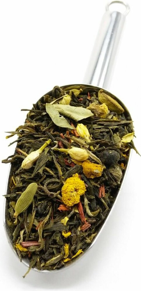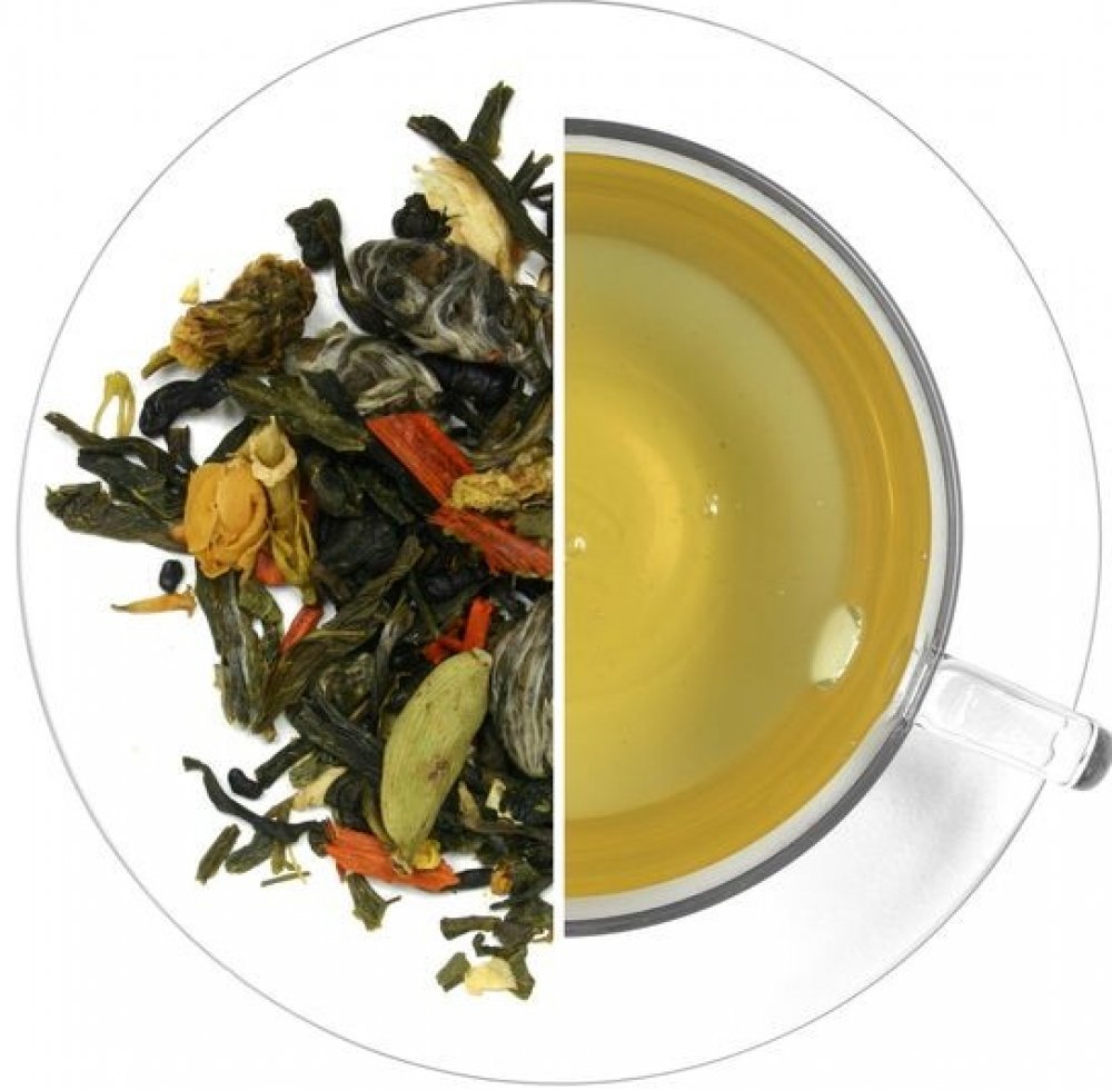 Pravé zelené čaje Sweet Flower, Yunnan Green, Formosa Gunpowder a Phoenix Eyes a pravý bílý čaj Snow Buds s vyváženou, lehce nasládlou chutí mandarinek. Složení: pravé zelené čaje Sweet Flower, Yunnan Green, Formosa Gunpowder a Phoenix Eyes, pravý bílý čaj Snow Buds, kardamom, aroma, santalové dřevo, kurkuma, chryzantéma, jasmín, osmanthus, listy kari. Může obsahovat stopy skořápkových plodů.