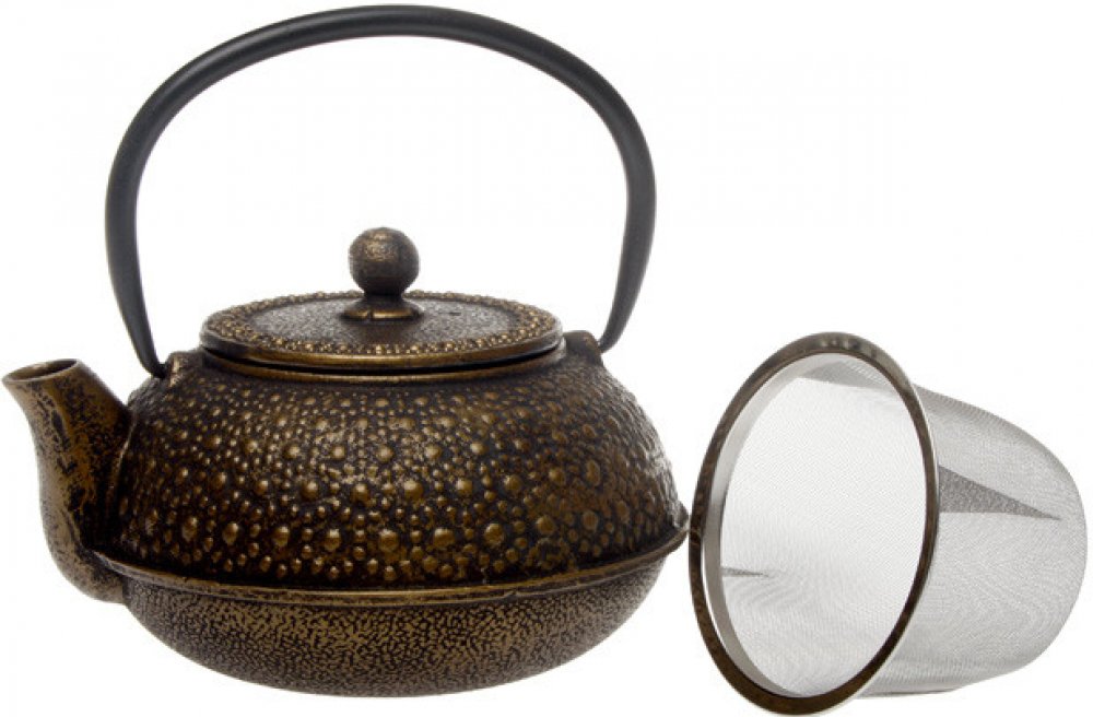 Hezká lehce zdobená litinová konvice na čaj nebo kávu se sítkem, ve které váš čaj vydrží teplý po dlouhou dobu.