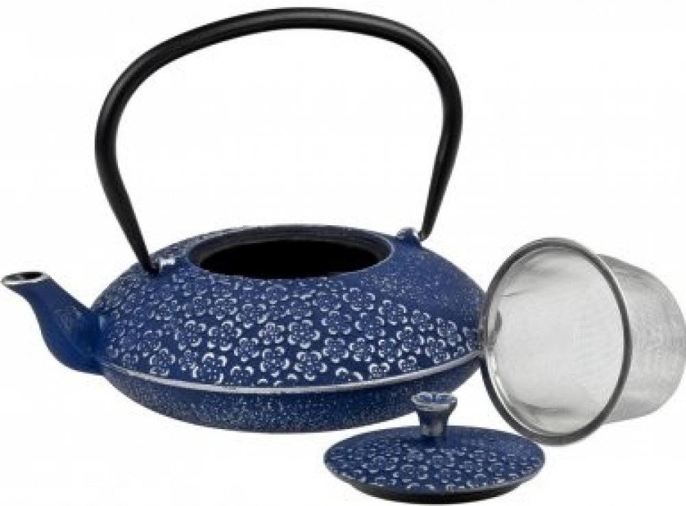 Hezky zdobená litinová konvice na čaj nebo kávu se sítkem v modré barvě, ve které váš čaj vydrží teplý po dlouhou dobu,