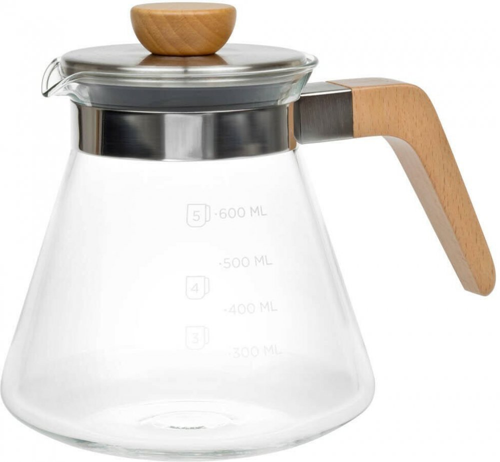 Skleněná konvička 0,6 l z borosilikátového skla s dřevěným uchem. Tepelná odolnost skla může být 500°C. Běžně se používá jako kávový / čajový servis v hotelech a kavárnách / čajových obchodech, proto se nedoporučuje klást ji přímo na sporák. Primárně není tato konvice určena na plotny či jiné ohřívače. Vzhledem k tomu, že výrobek je křehký, zejména části z bukového dřeva, doporučujeme ruční mytí.