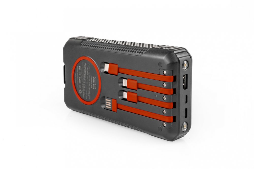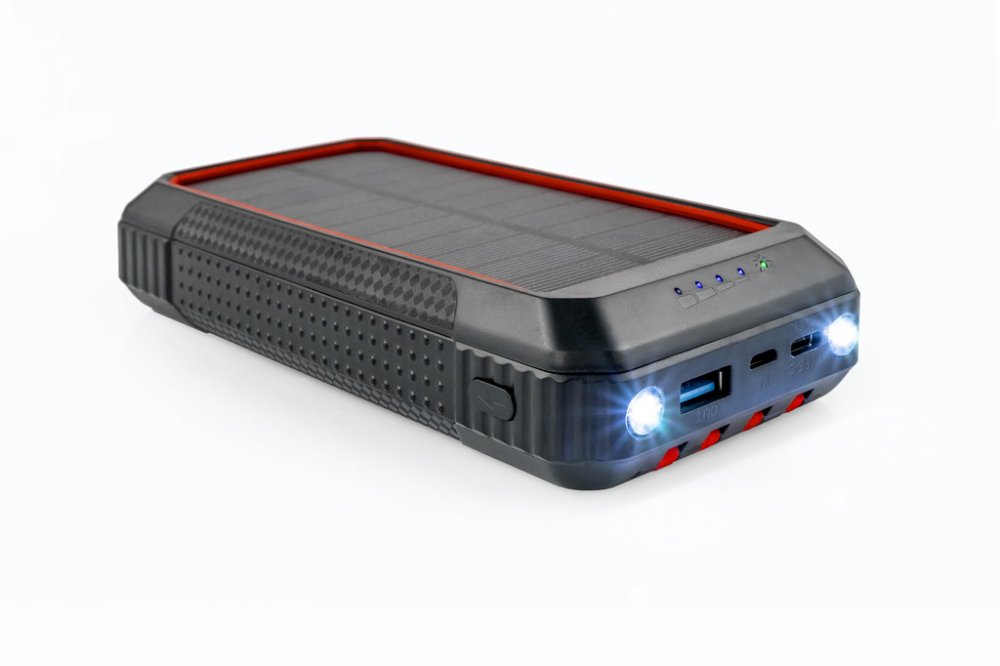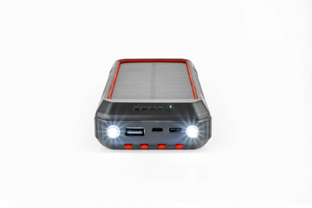 Powerbanka je velmi odolná, po stranách vyztužena nárazuvzdorným materiálem. V těle produktu jsou umístěny dvě výkonné LED diody s funkcemi přísvit, SOS a stroboskop.Je takskvělým parťákem k outdoorovému dobrodružství, kde vás díky velké kapacitě baterie, solárnímu panelu, LED a pevné konstrukci nenechá nikdyve štychu. Chytrým detailem je otvor pro šňůrku.