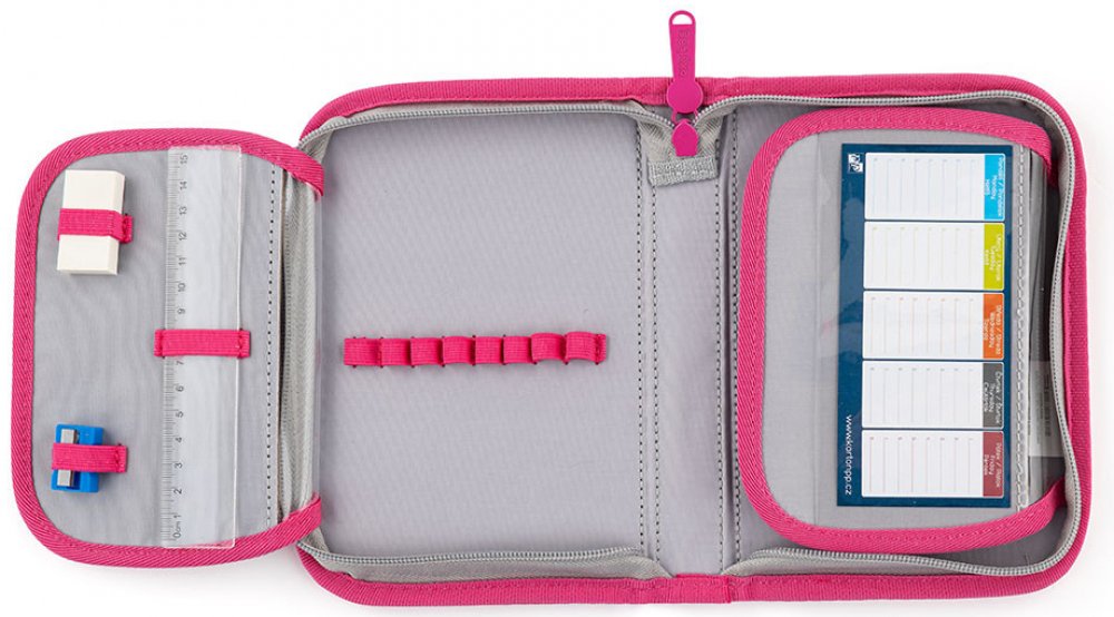Pouzdro je dostatečně prostorné, nic se proto nebude válet v batohu. A aby měly vaše děti přehled, jaký předmět je zrovna čeká, je v pouzdře i průhledná folie pro rozvrh hodin.