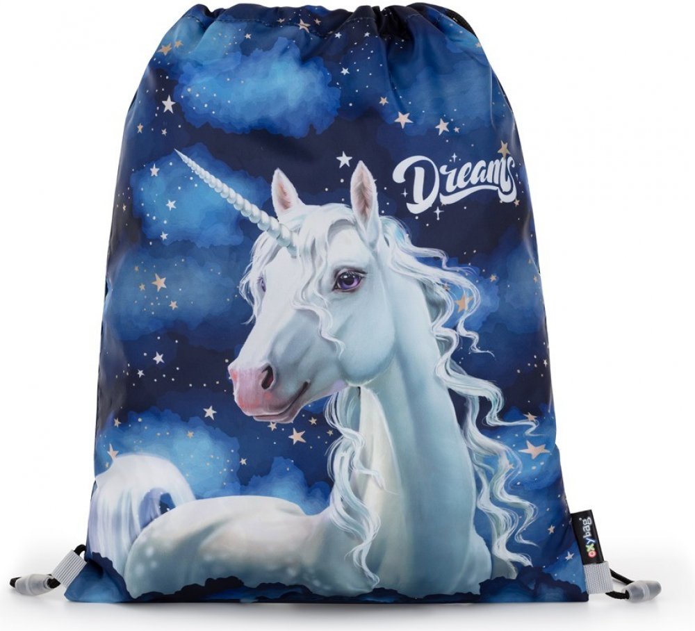 Modrý sáček na přezůvky s jednorožcem pro malé školačky!Sáček Unicorn 1 2024 je praktický doplněk s kouzelným motivem, který si zamiluje každá holčička.