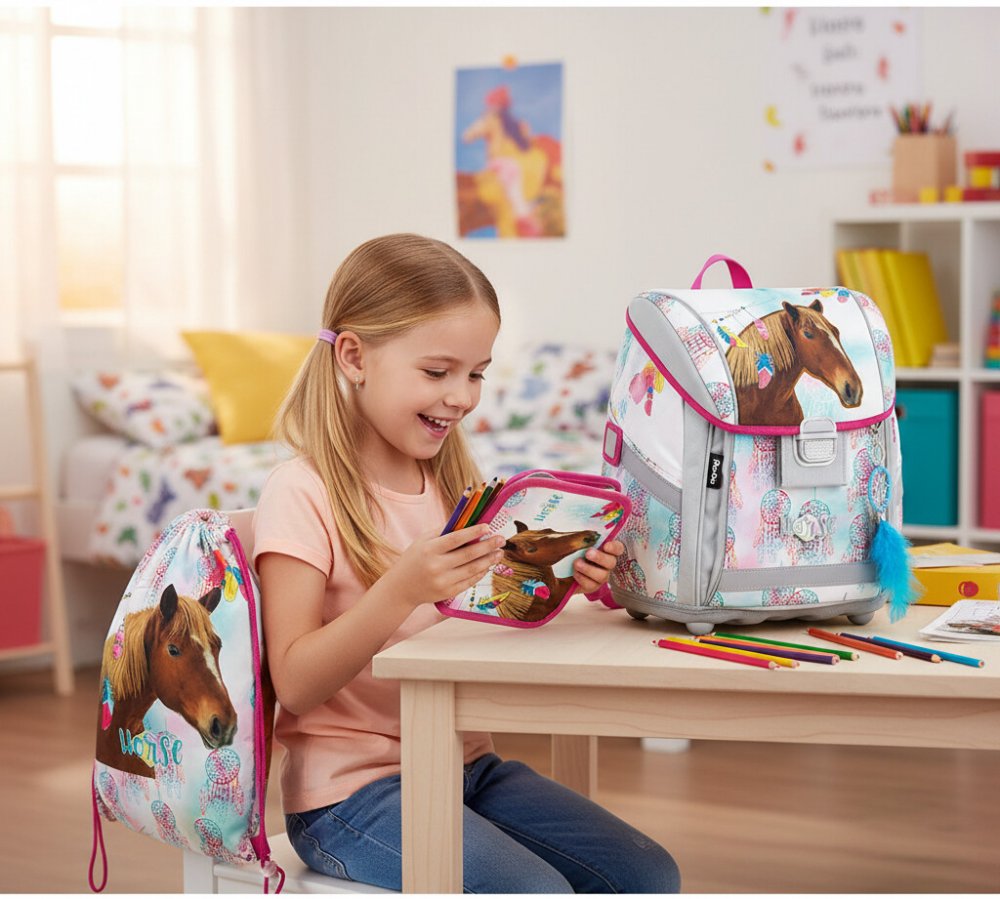Kompletní školní set pro prvňáčka obsahuje vše, co potřebují na svůj začátek. Školní batoh Premium Light, vak na záda a nenaplněný jednopatrový penál.